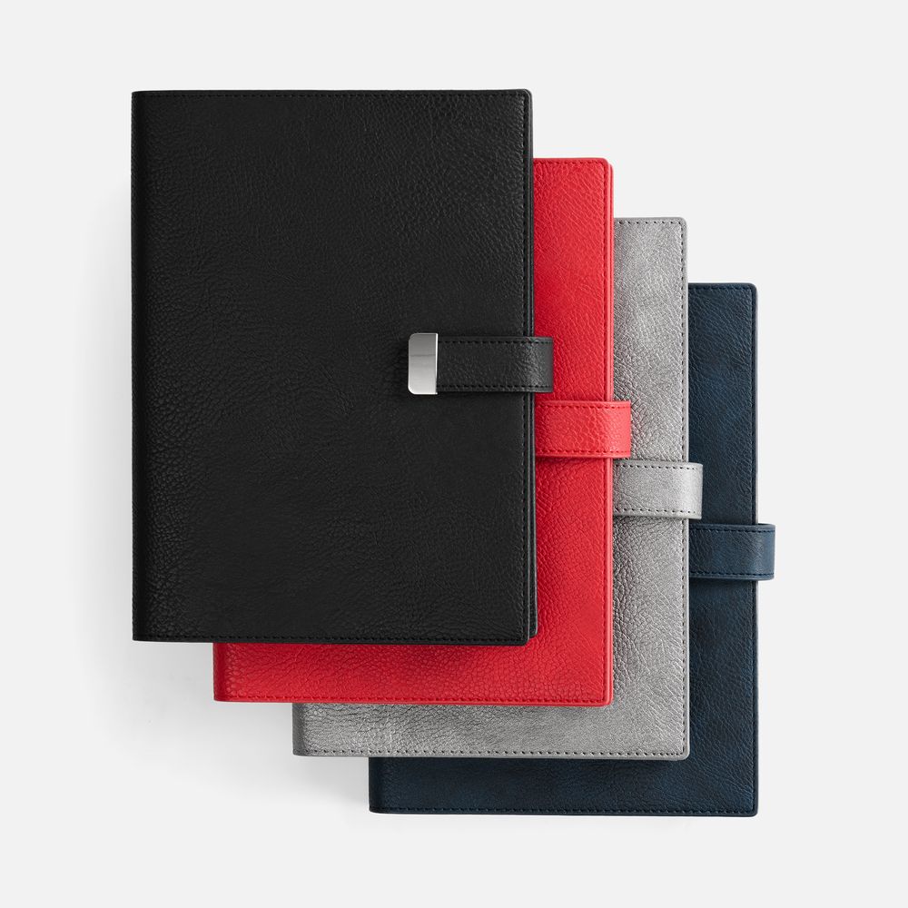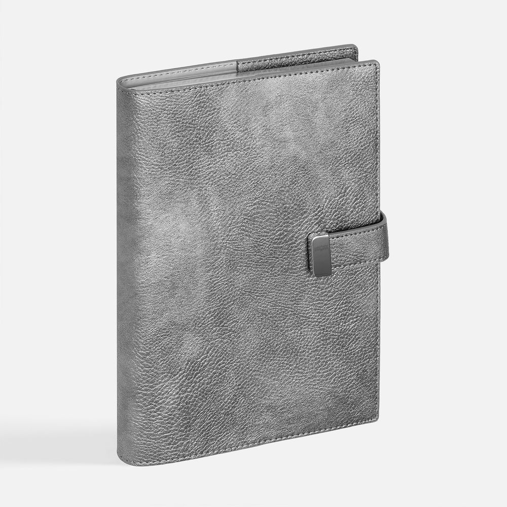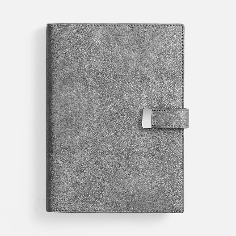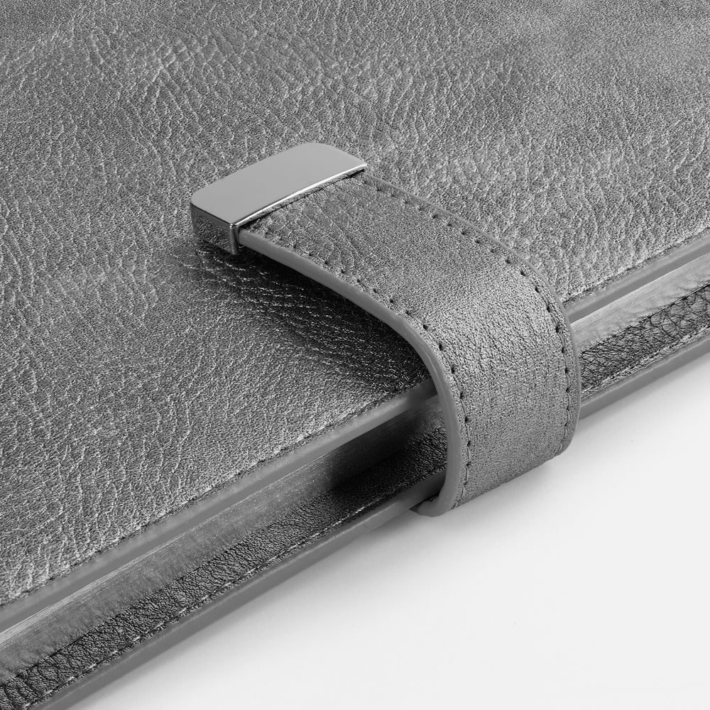 Ежедневник в мягком переплете со съёмная обложкой, дополнен застёжкой-хлястиком с металлическим шильдом на кнопке, двойным ляссе и капталом.