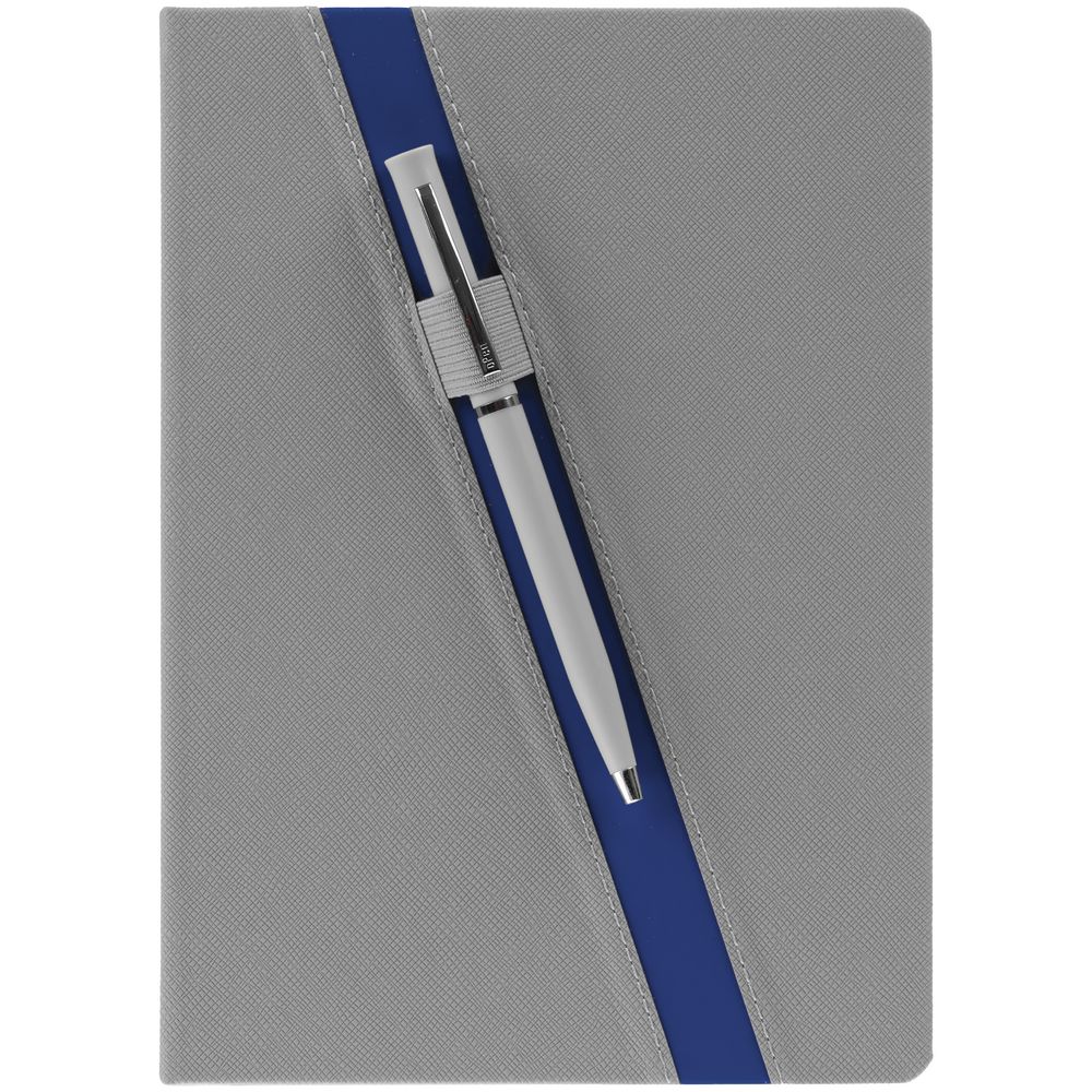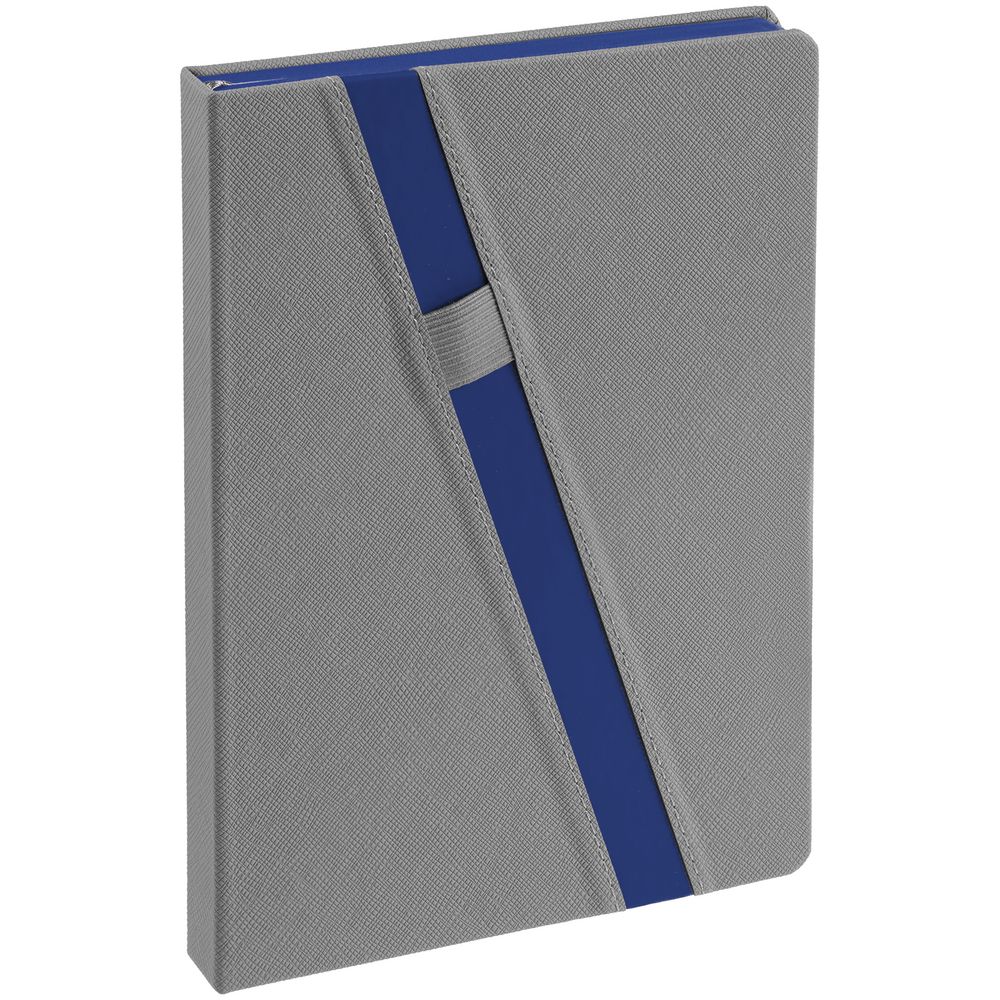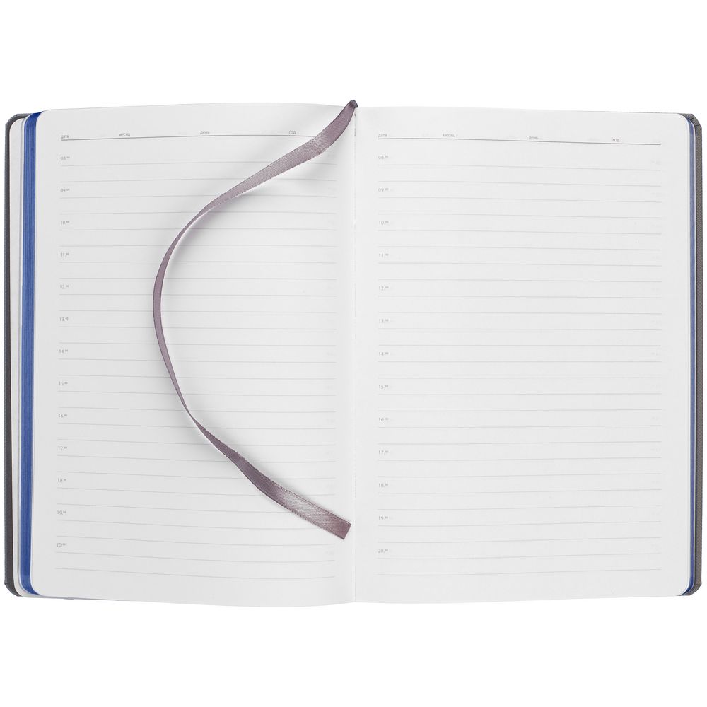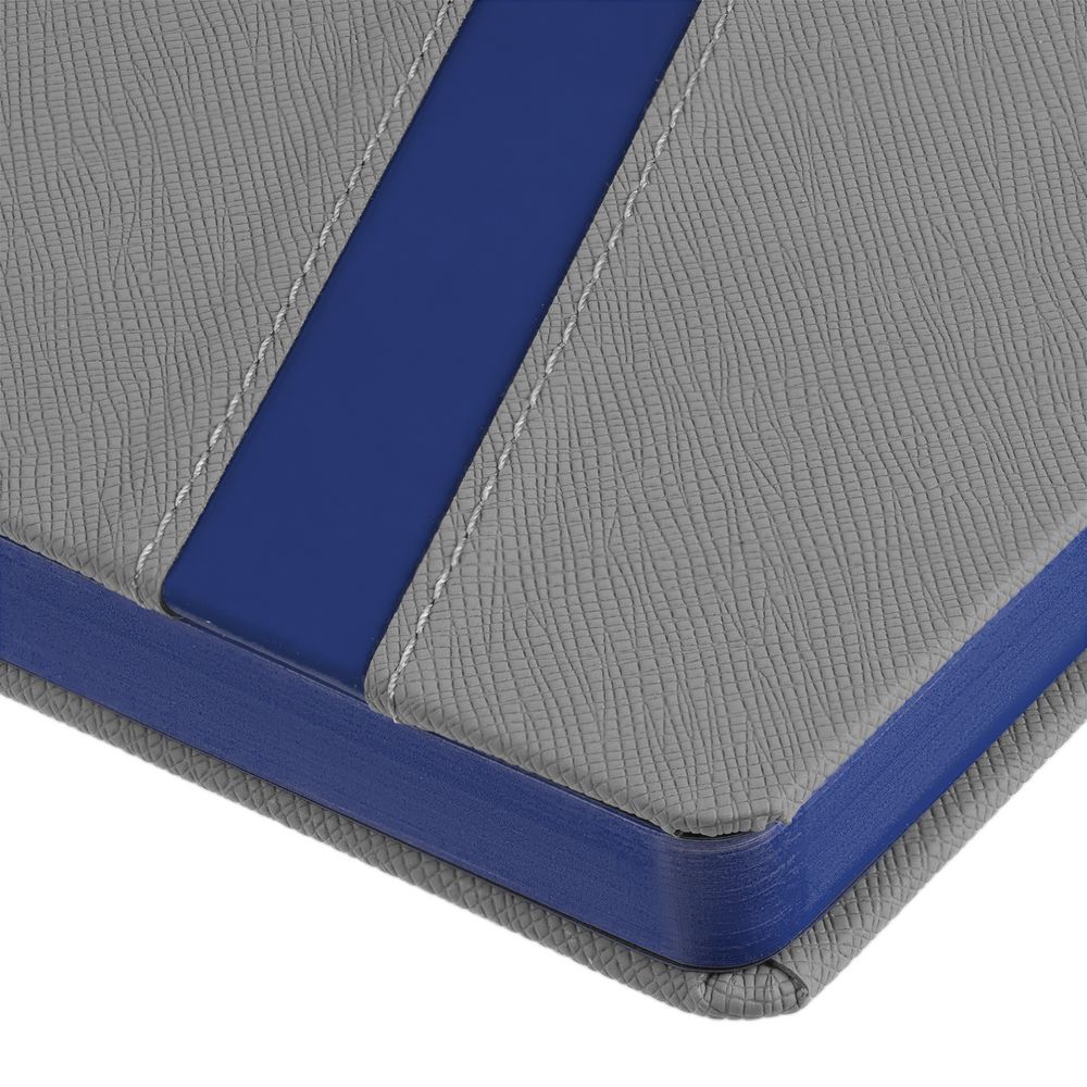 Ежедневник с твердой обложкой и тонированным обрезом. Выполнен из материала Nice Touch, серый СС, и Soft Touch Ultra, синий НН, дополнен серым ляссе.