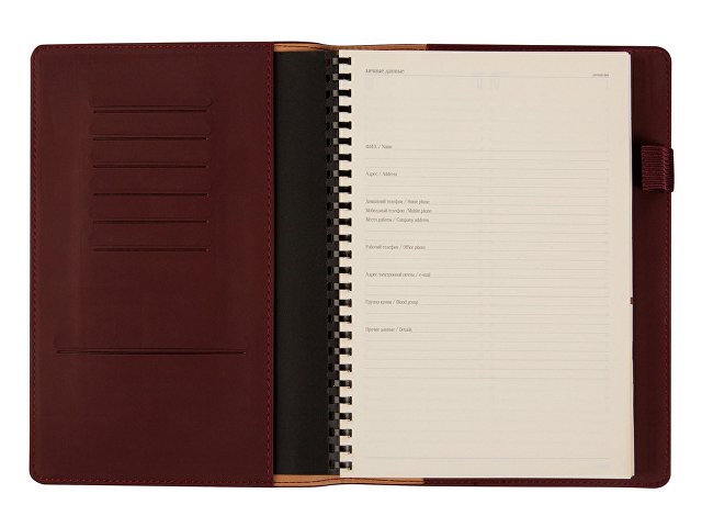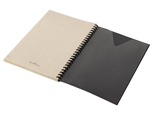 Блок является сменным и вставляется внутрь обложки. С внутренней стороны обложка имеет вырубные отделения для визиток и кредитных карт, а также петлю для ручки на резинке. Для хранения чеков, записок и бумаг внутри расположен прозрачный пластиковый конверт. Тиснение (Блинт) на данный товар осуществляется бесплатно. Оплачивается только настройка оборудования в размере 6200 рублей на весь тираж.