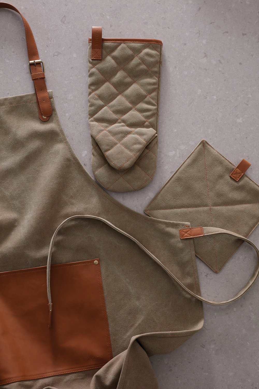 Прочный фартук из вареного канваса плотностью 500 г/м² декорирован деталями под натуральную кожу. Благодаря текстуре ткани со временем изделие становится только лучше.
