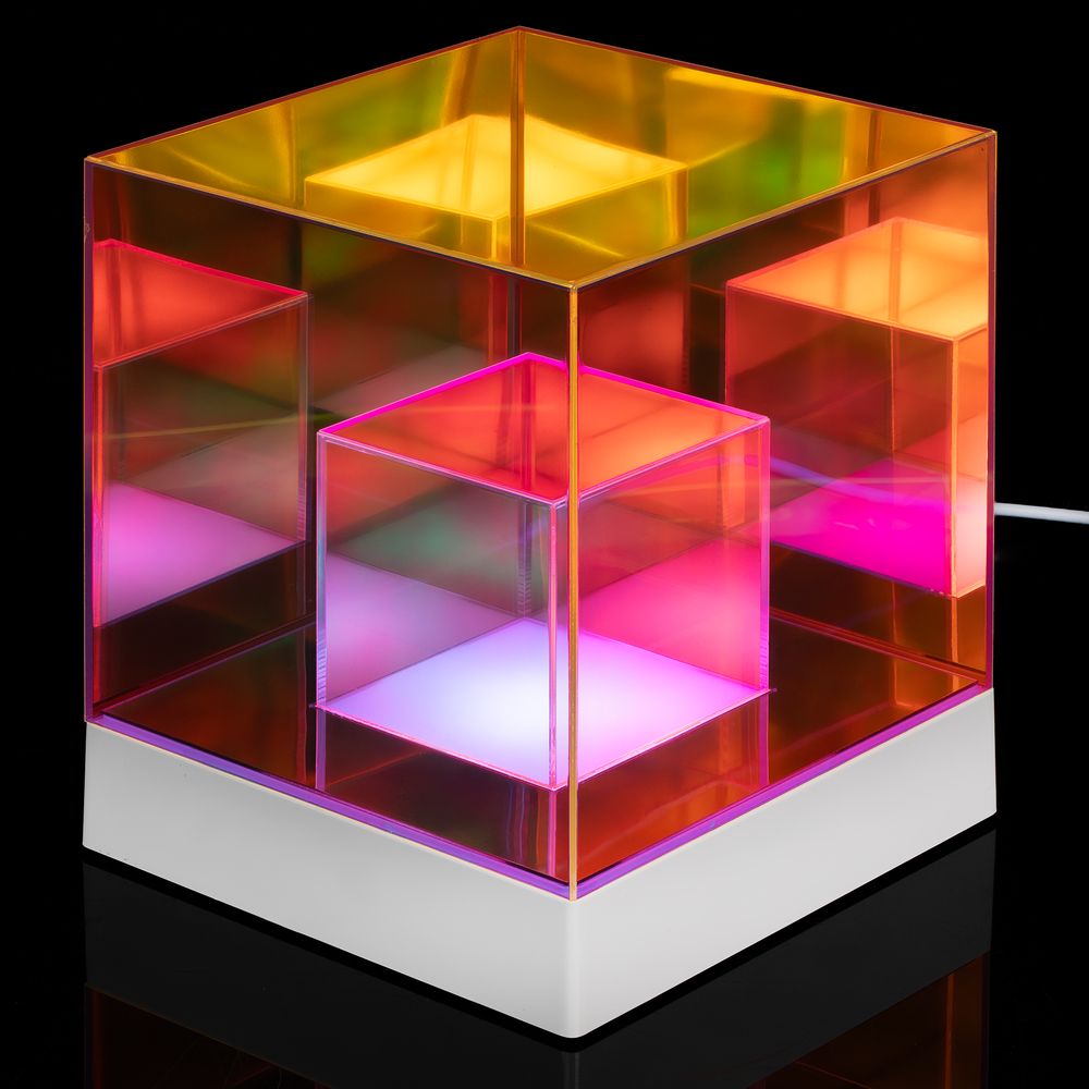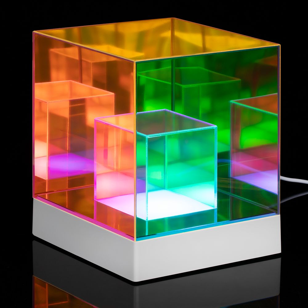 Cubini — интерьерный светильник с разноцветной подсветкой и удивительным эффектом оптических иллюзий. Разные оттенки граней и множественные отражения мгновенно притягивают взгляд и заставляют рассматривать кубик снова и снова.