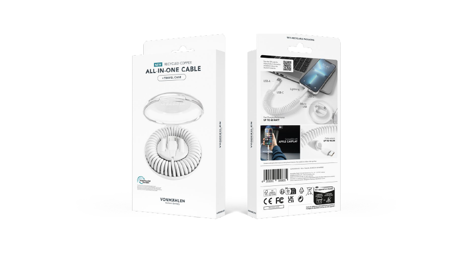 Allroundo® eco - экологичный компактный универсальный кабель черного цвета для зарядки и передачи данных (с USB-C на USB-C) с возможностью быстрой зарядки, который более чем на 75 % состоит из переработанных материалов. Спиральный кабель, длина которого достигает 90 см, теперь обеспечивает еще большую адаптируемость и свободу передвижения во время процесса зарядки. Оснащен входом/выходом USB-C. В комплект входят адаптеры USB-A, Micro-USB и Lightning, поэтому кабель подходит для всех современных устройств.