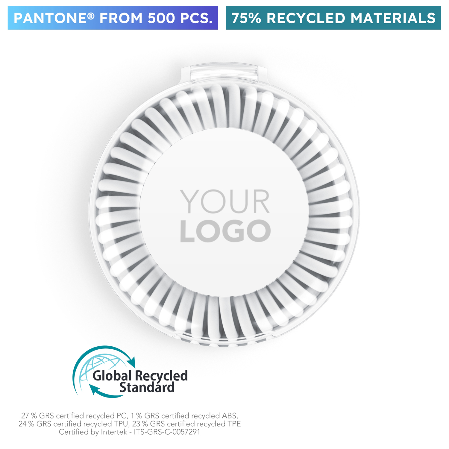 Материалы: 27 % сертифицированный GRS rPC, 1 % сертифицированный GRS rABS, 24 % сертифицированный GRS rTPU, 23 % сертифицированный GRS rTPE, нержавеющая сталь, цинк, медь.