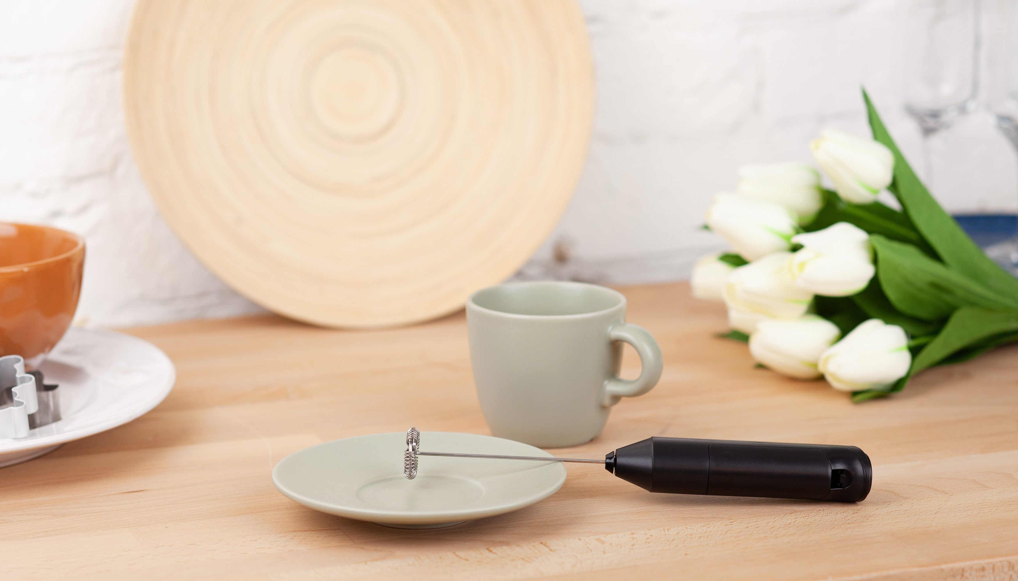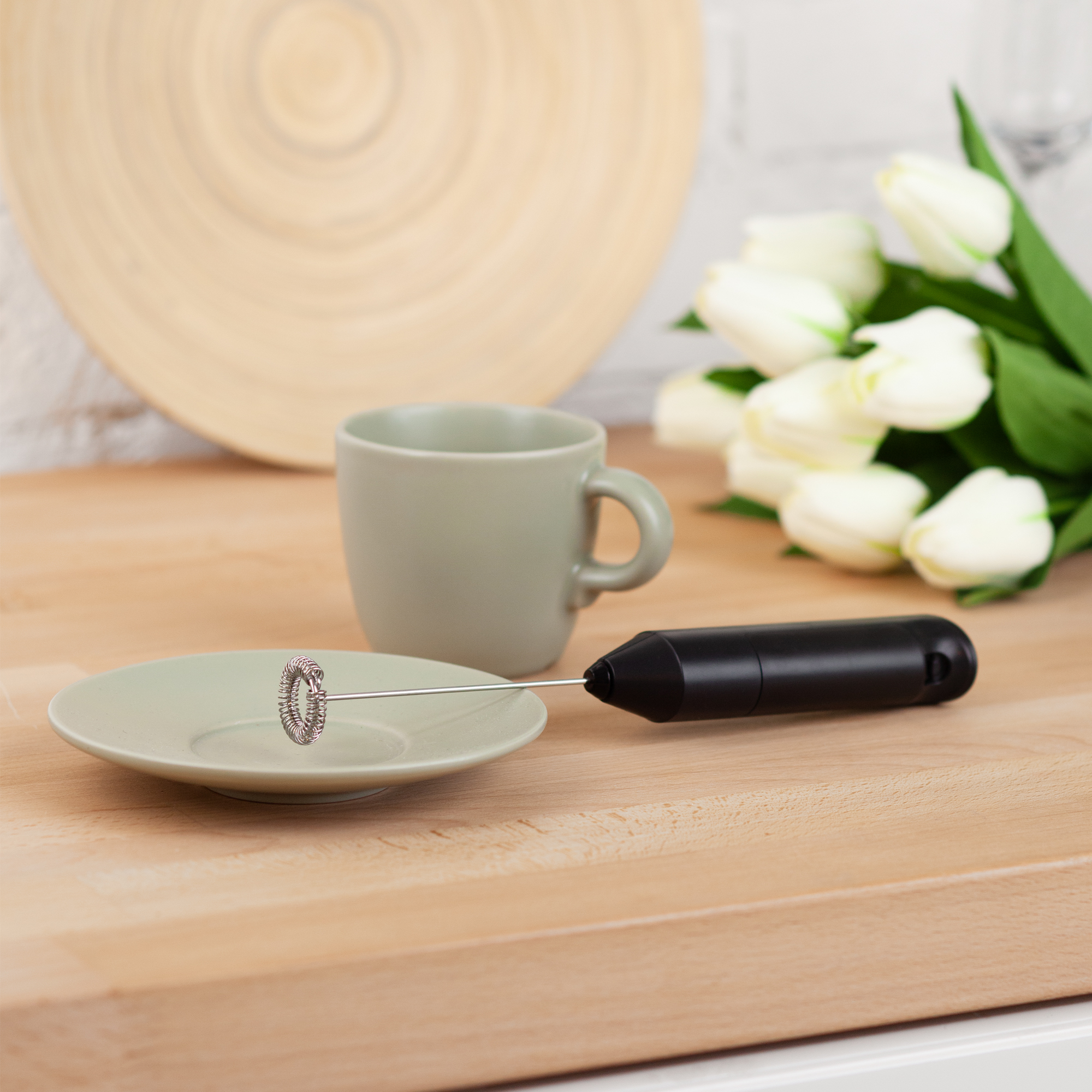 Капучинатор работает от батареек тип АА 2 шт., нет в комплекте. Расчетное время работы до 60 минут.