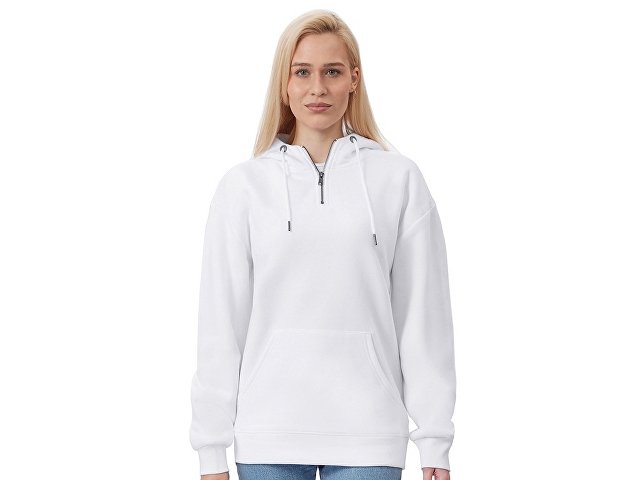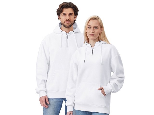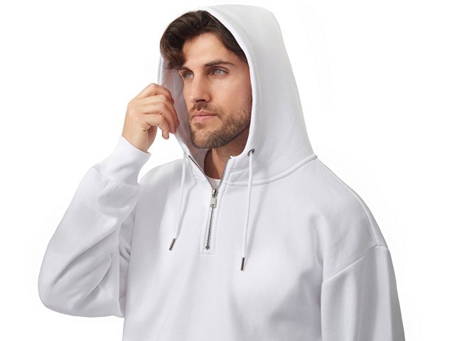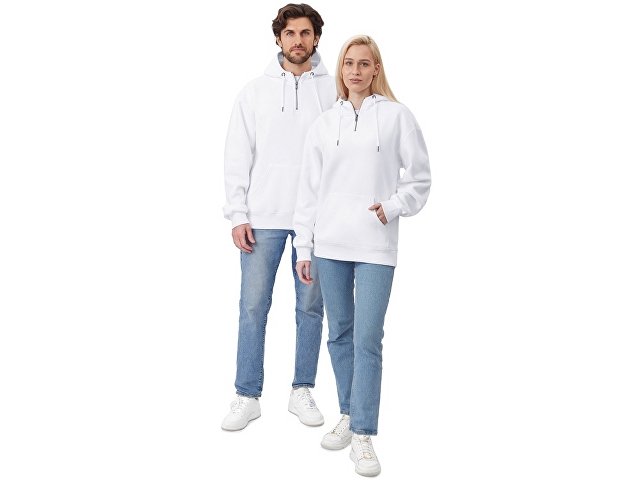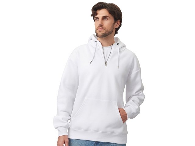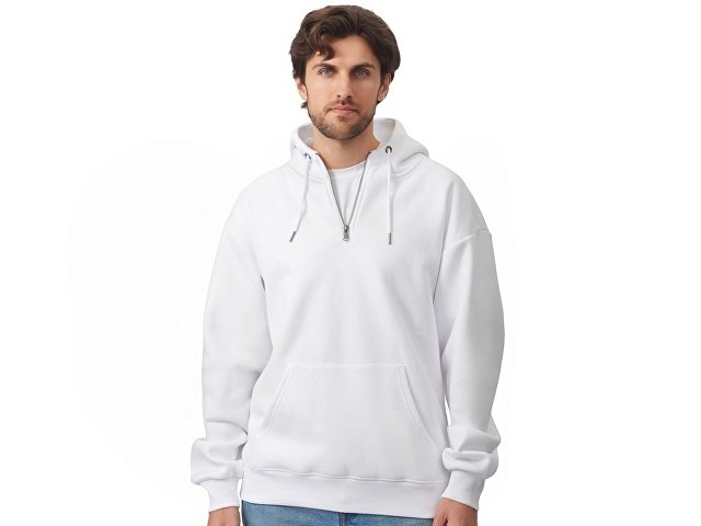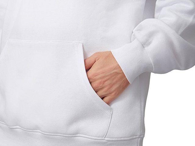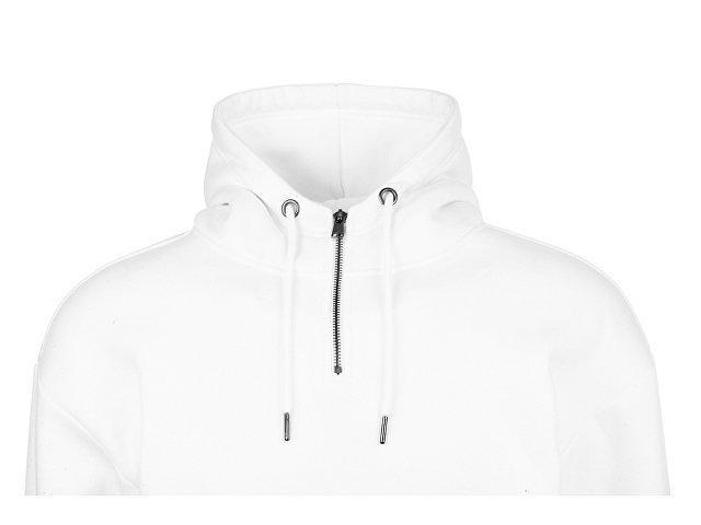 Худи с капюшоном ворот на молнии. Шнур в капюшоне с металлическими наконечниками. Отделка горловины спинки внутри тесьмой, Риб 2х2 по низу изделия и манжетам. Удобный карман кенгуру. Трафаретная печать (1 цвет (белые изделия)) на данный товар осуществляется бесплатно. Оплачивается только настройка оборудования в размере 8200 рублей на весь тираж.