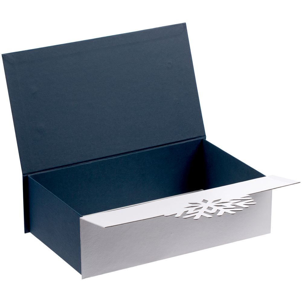 Коробка из переплётного картона, кашированного дизайнерской бумагой Classy Covers и Majestic. Крышка в форме снежинки на магнитах.