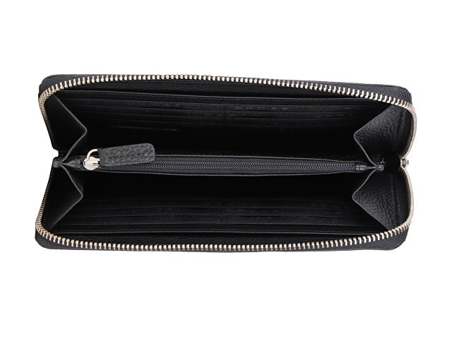 Кошелек закрывается на молнию, включает в себя: одно отделение на молнии, два отделения для купюр, два универсальных отделения, шестнадцать отделений для кредитных карт.