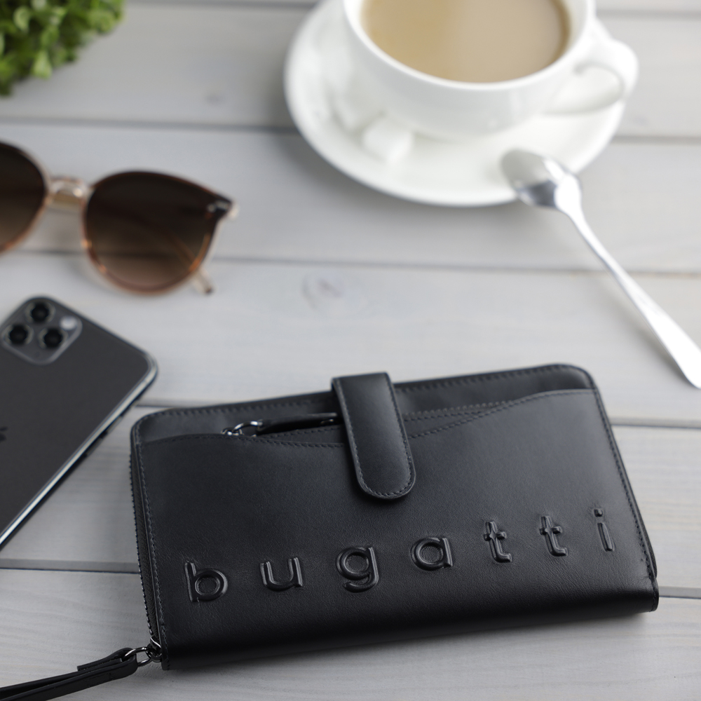 Кошелёк женский BUGATTI Daphne с ключницей, чёрный цвет, воловья кожа/полиэстер, 19х3х11 см