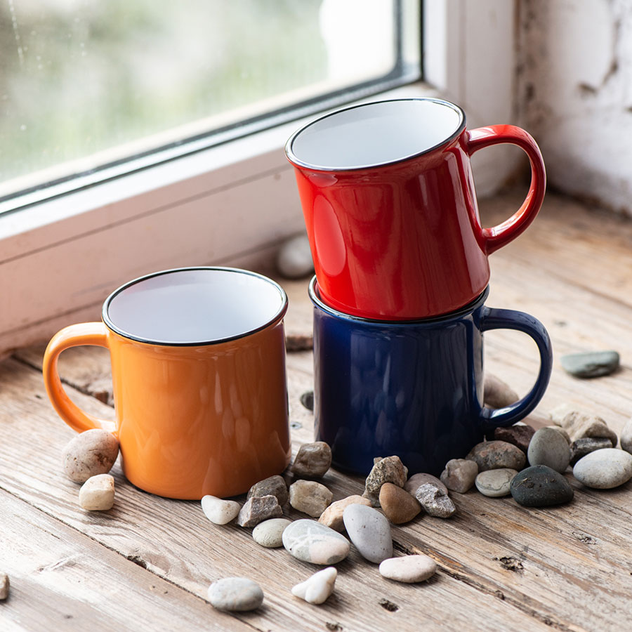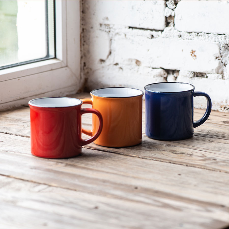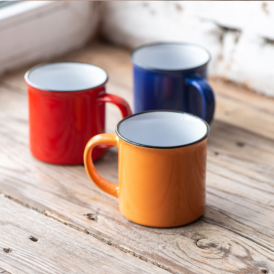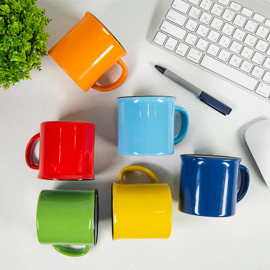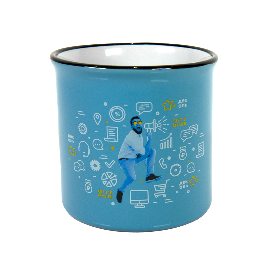 Кружка всем знакомой формы из советского прошлого. Она прочно обосновалась как в рознице, так и на рынке бизнес сувениров. Это своего рода ретро маркетинг, когда продукт имеет эмоциональную ностальгическую привязку к прошлому, к чему то родом из детства. Яркие цвета, черный кант Цвет близкий к Pantone 286C