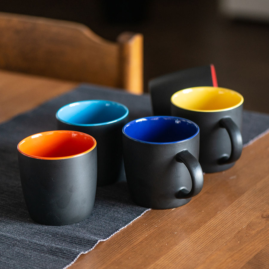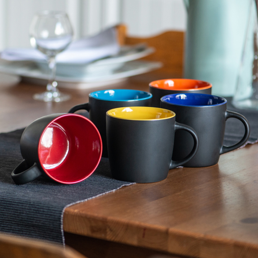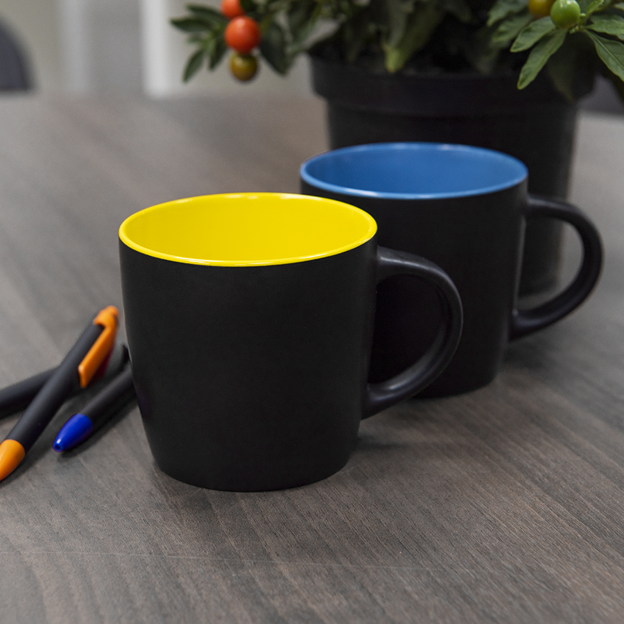 Оригинальная керамическая кружка INTRO объёмом в 350 мл с матовым черным покрытием и яркой цветной внутренней частью будет смотреться эффектно и выразительно на любой поверхности и в любом интерьере. Черный цвет сам по себе способен все оттенить и сделать ярче, а матовый черный делает продукт дороже, солиднее и респектабельнее. Только посмотрите на эти смелые сочетания застывшей вулканической лавы с горной породой, малины в горьком шоколаде, насыщенной почвы с яркой травой или сочного подсолнуха с черными семечками! Благодаря интересному сочетанию цветов кружки INTRO идеально подходят к линейке ручек FORTE SOFT BLACK с черным корпусом софт и яркими элементами. Креативно, благородно и интересно – отличный вариант для корпоративной кухни, авторских кафе или творческих заведений! *Внимание! Логотип mycup на донышке может быть неустойчив к истиранию после воздействия высокой температуры обжига (горячая и холодная деколь) или мытья в посудомоечной машине. Цвет близкий к Pantone 2736C