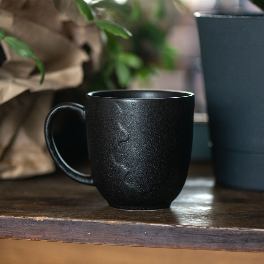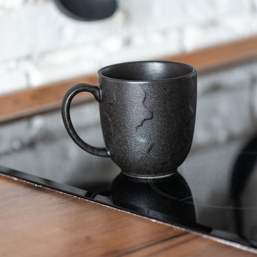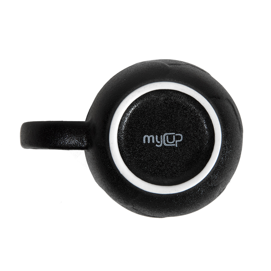 Кружка большого размера с удобной ручкой. Наружная и внутренняя части черного цвета. С одной стороны, покрытие напоминает чугун и выстраивает ассоциативный ряд со старинными решетками, дверьми и ключами от них.