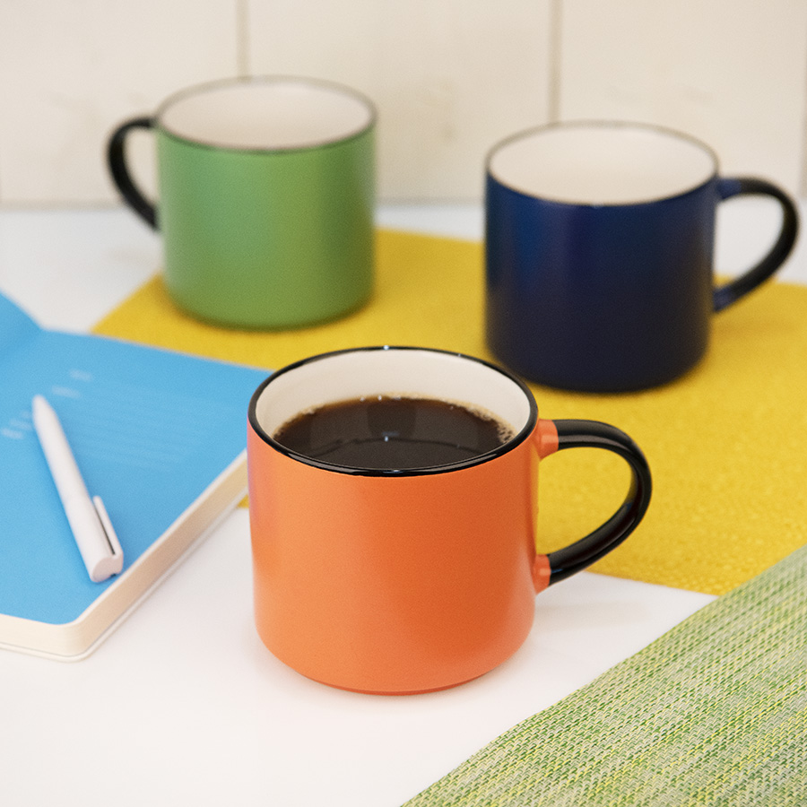 Ёмкая кружка трендовой цилиндрической формы с матовым покрытием.Яркий цветной корпус с черной ручкой и кантом по краю.Цвет близкий к Pantone 165C