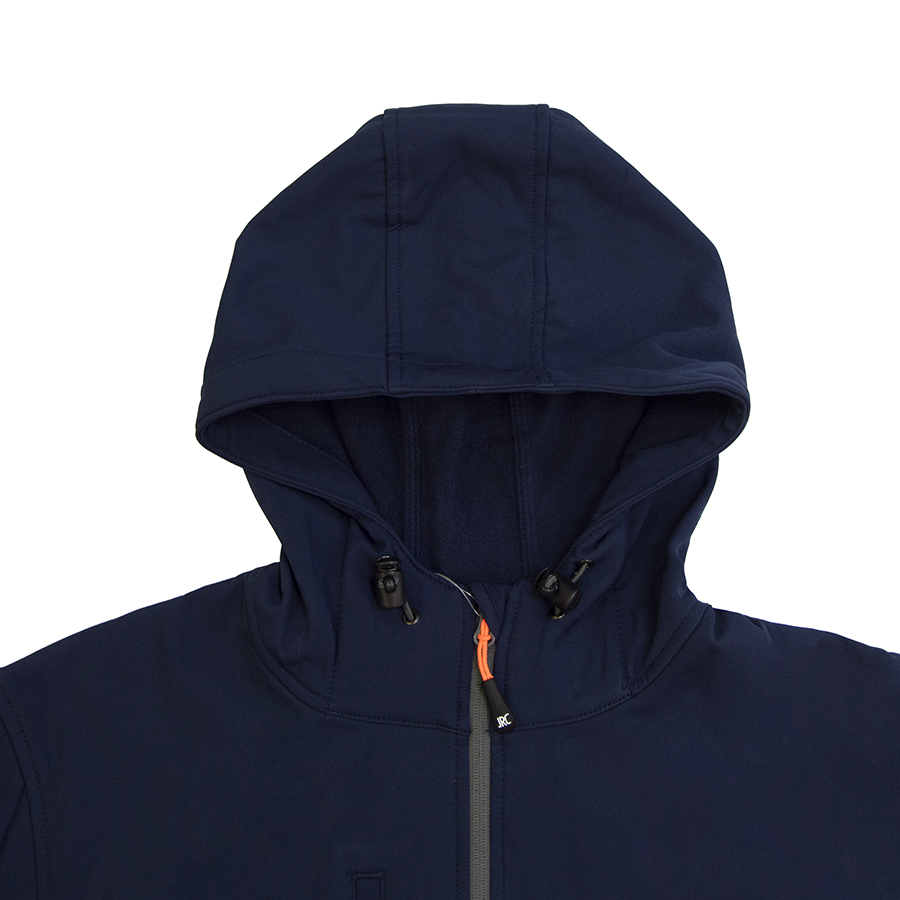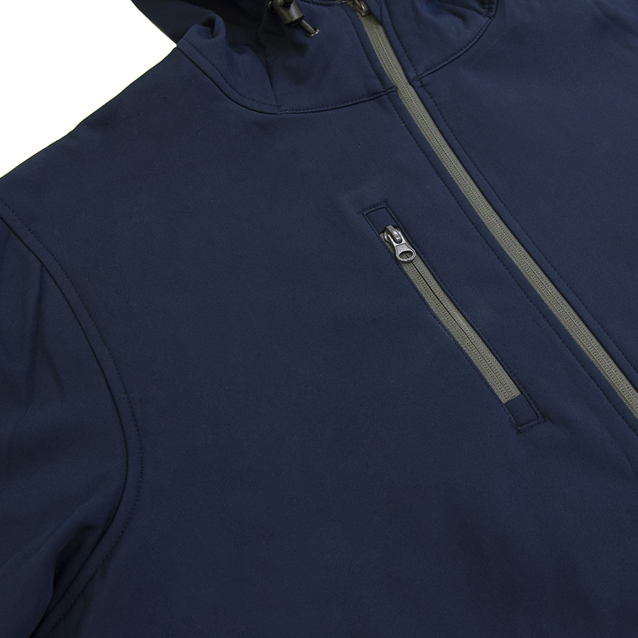 Ткань softshell. Водонепроницаемая и дышащая двухслойная куртка. Обратная облегченная пластиковая молния со съемным пуллером. Один нагрудный и два боковых кармана на молнии. Утягивающий шнурок по низу куртки. Регулируемые манжеты на липучке.