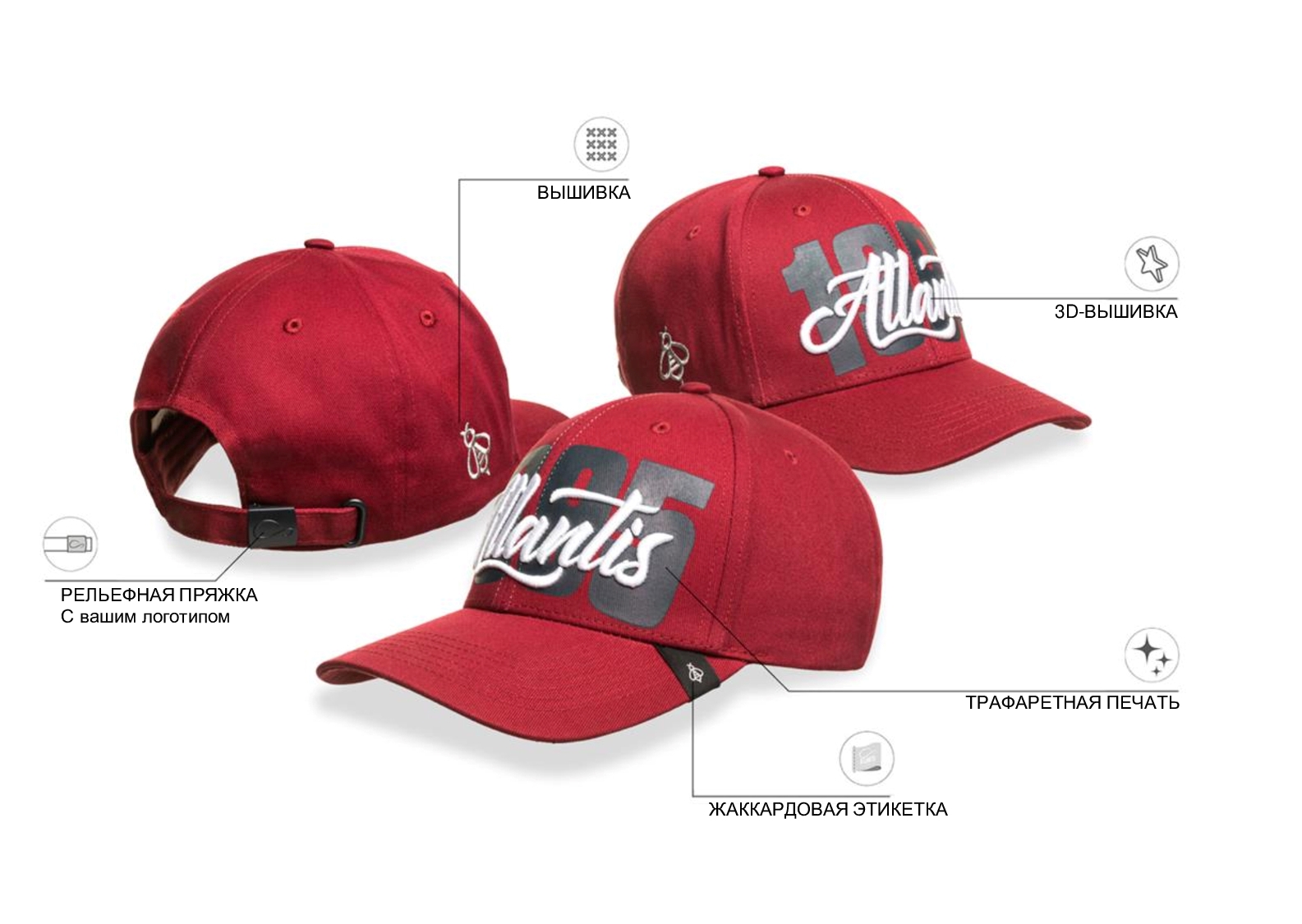3Д-вышивка поверх принта на передней панели Плоская вышивка на боковой панели Жаккардовый лейбл на козырьке Цены: При заказе 576 шт. – 1987р. При заказе 1008 шт. – 1599р. Изготовление и доставка образцов в Москву – 60 дней; Производство и доставка партии в Москву – 180 дней. При авиадоставке срок сокращается до 60 дней, цена изделия увеличивается на 370р. Все логотипы на образце сделаны справочно для вашего ознакомления и будут изменены в соответствие с вашим дизайном в процессе производства. 58 см - минимальный размер, с помощью застёжки его можно увеличить до необходимого.