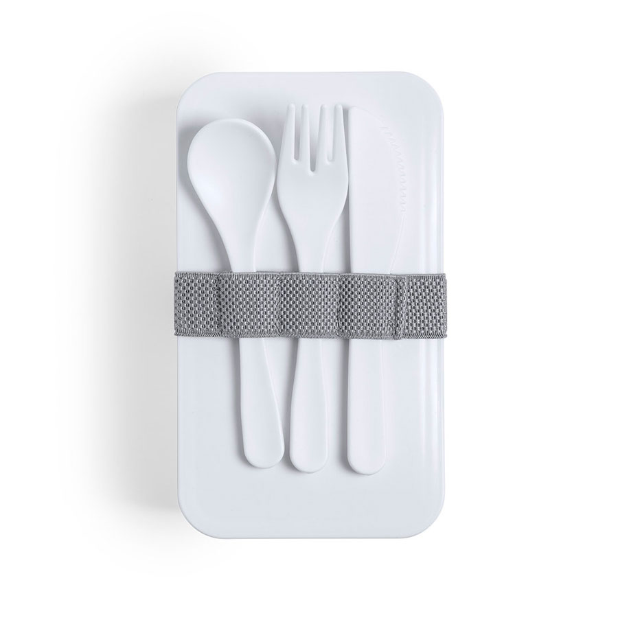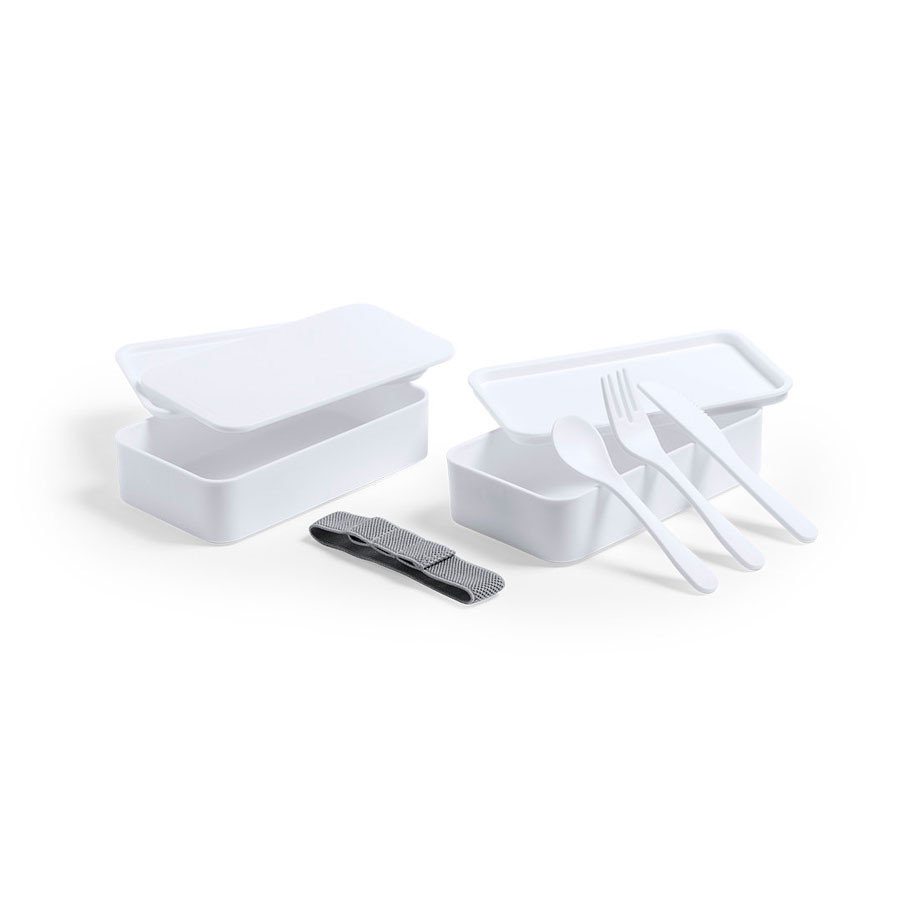 Ланч-бокс с двумя контейнерами, крышками и столовыми приборами: ложка, вилка, нож. Они крепятся на специальной резинке на корпусе изделия. Ланч-бокс изготовлен из особого антибактериального пластика (BPA free) и упакован в специальный пакет. Антибактериальный пластик снижает уровень бактерий, присутствующих на поверхностях, благодаря добавлению постоянных статических микробных агентов, с высокой эффективностью предотвращающих бактериальное загрязнение. Изделие соответствует стандарту ISO 22196, который определяет антибактериальную активность в пластичных материалах и непористых поверхностях. Ланч-бокс подходит для использования в микроволновой печи, посудомоечной машине и холодильнике.