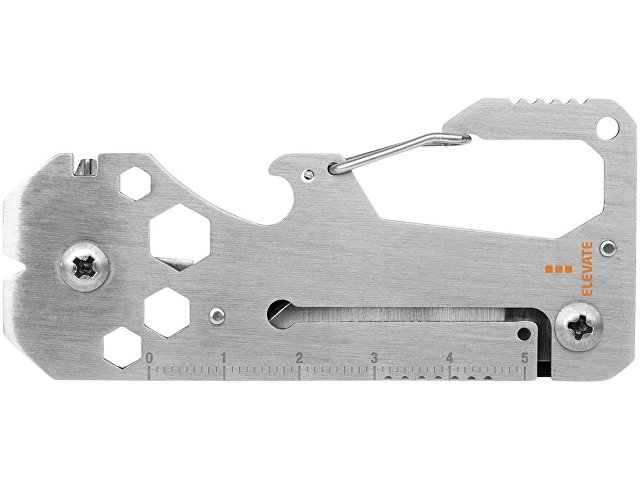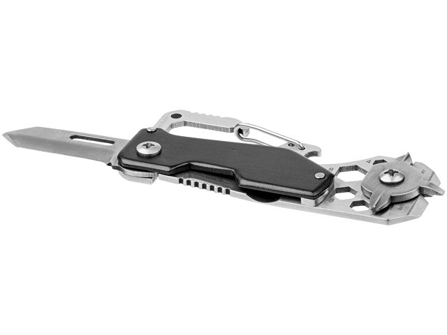 Многофункциональный инструмент Teron. Легкий многофункциональный инструмент с ножиком, карабином, линейкой, открывалкой, 4-мя шестигранными ключами, спицевым ключом, гвоздодером, 1 плоской отверткой, 1 маленькой и 1 большой отвертками Philips. Упакован в подарочную коробку Elevate. Алюминий. Гравировка (оптоволоконный лазер) (Без чернения) на данный товар осуществляется бесплатно. Оплачивается только настройка оборудования в размере 1100 рублей на весь тираж.