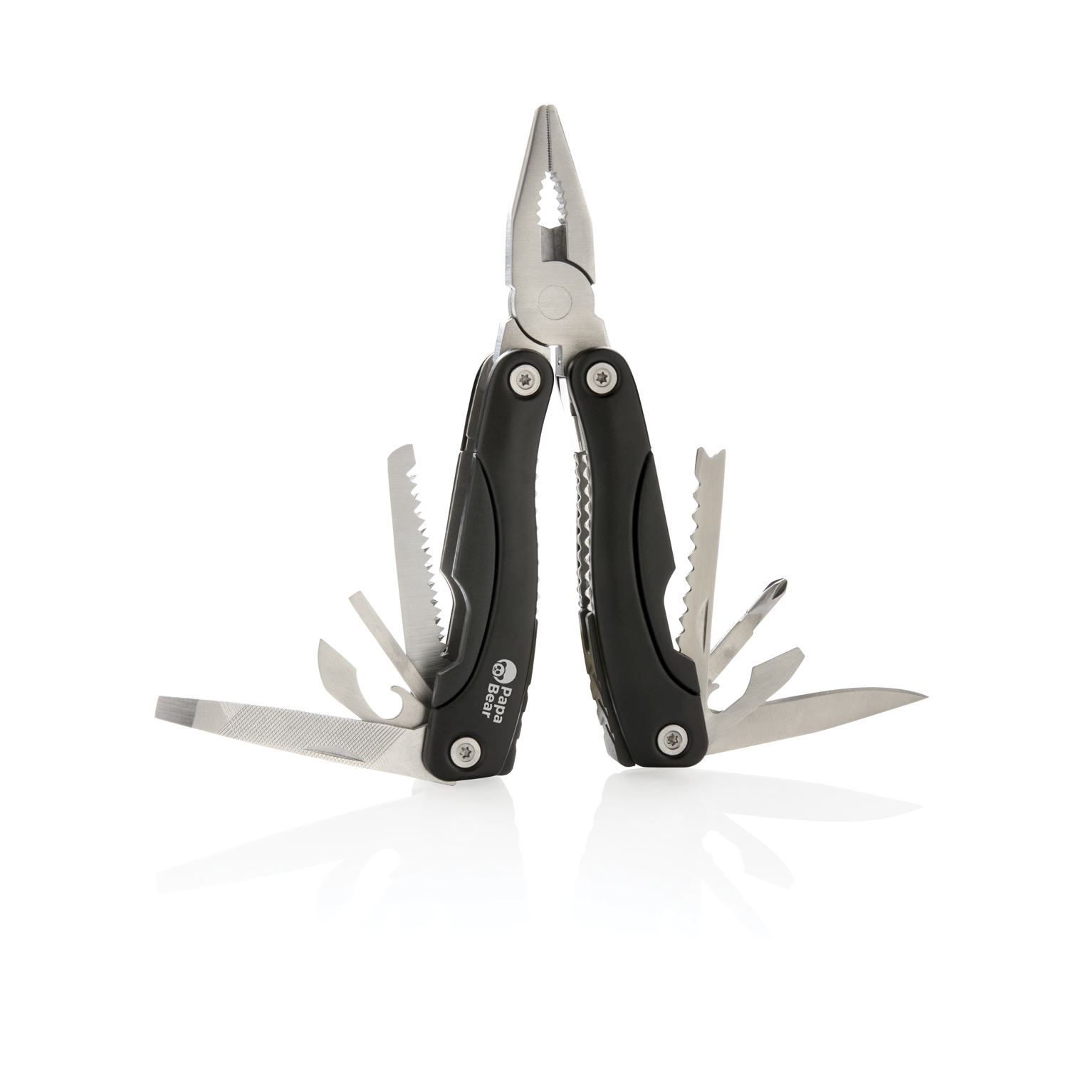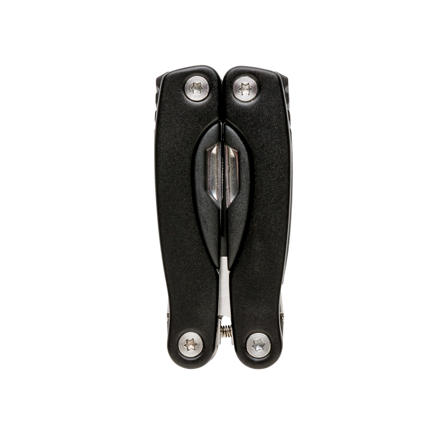 Это алюминиевый многофункциональный инструмент с ручками черного цвета совмещает в себе 14 функций. В комплект входит черный чехол 600D.