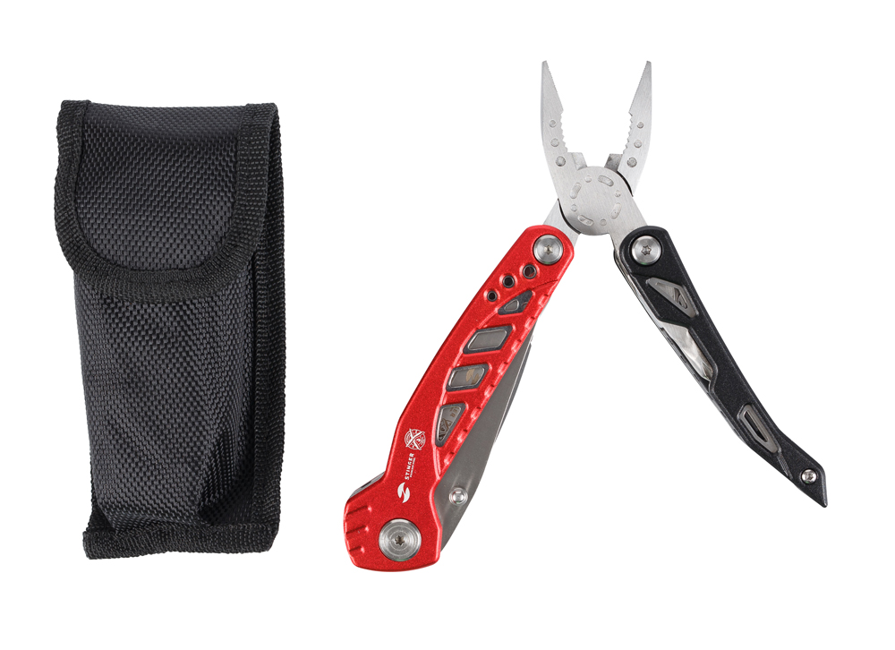 Мультитул Stinger, 107x37 мм, 11 функций, сталь/алюминий, красно-чёрный, в нейлоновом чехле