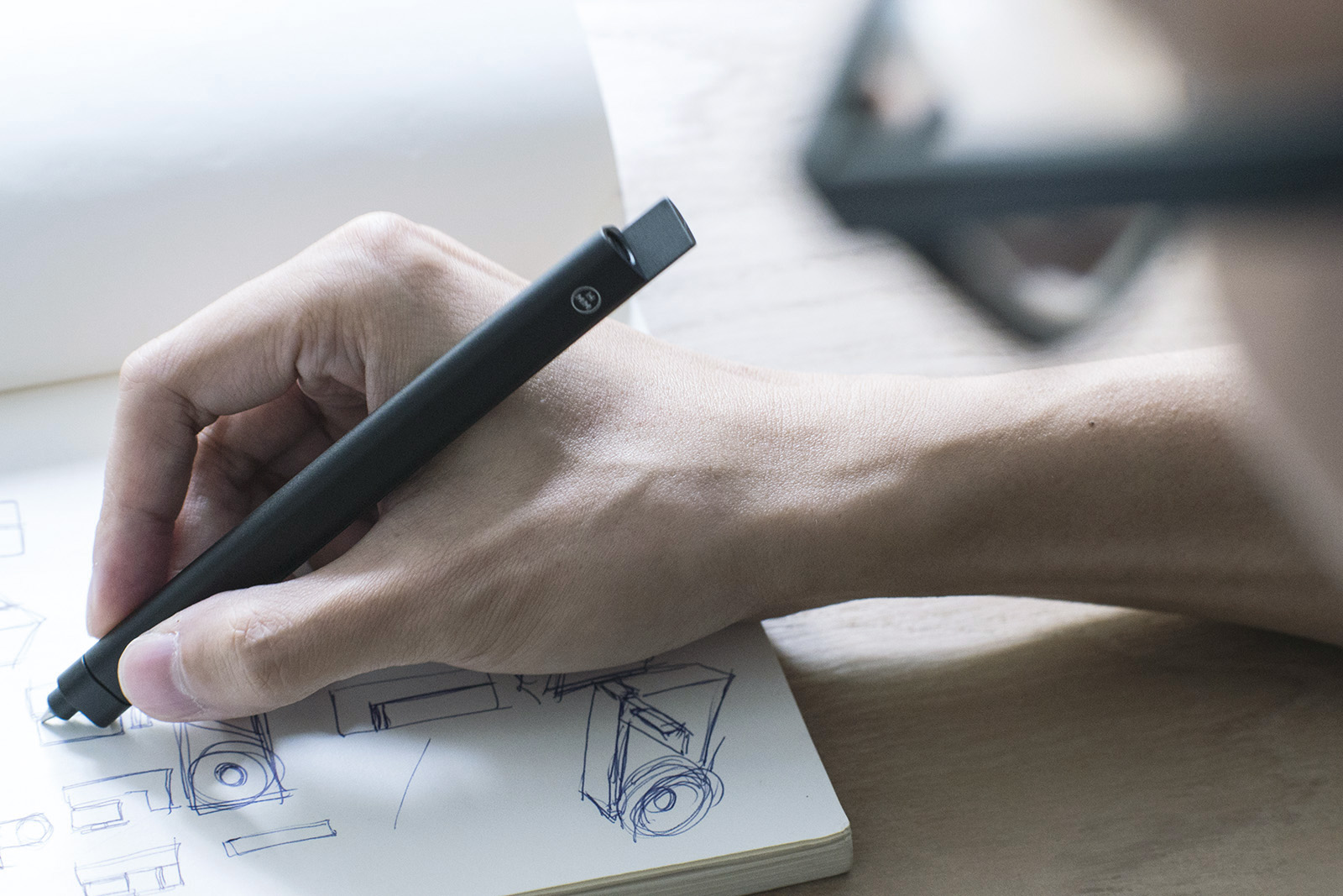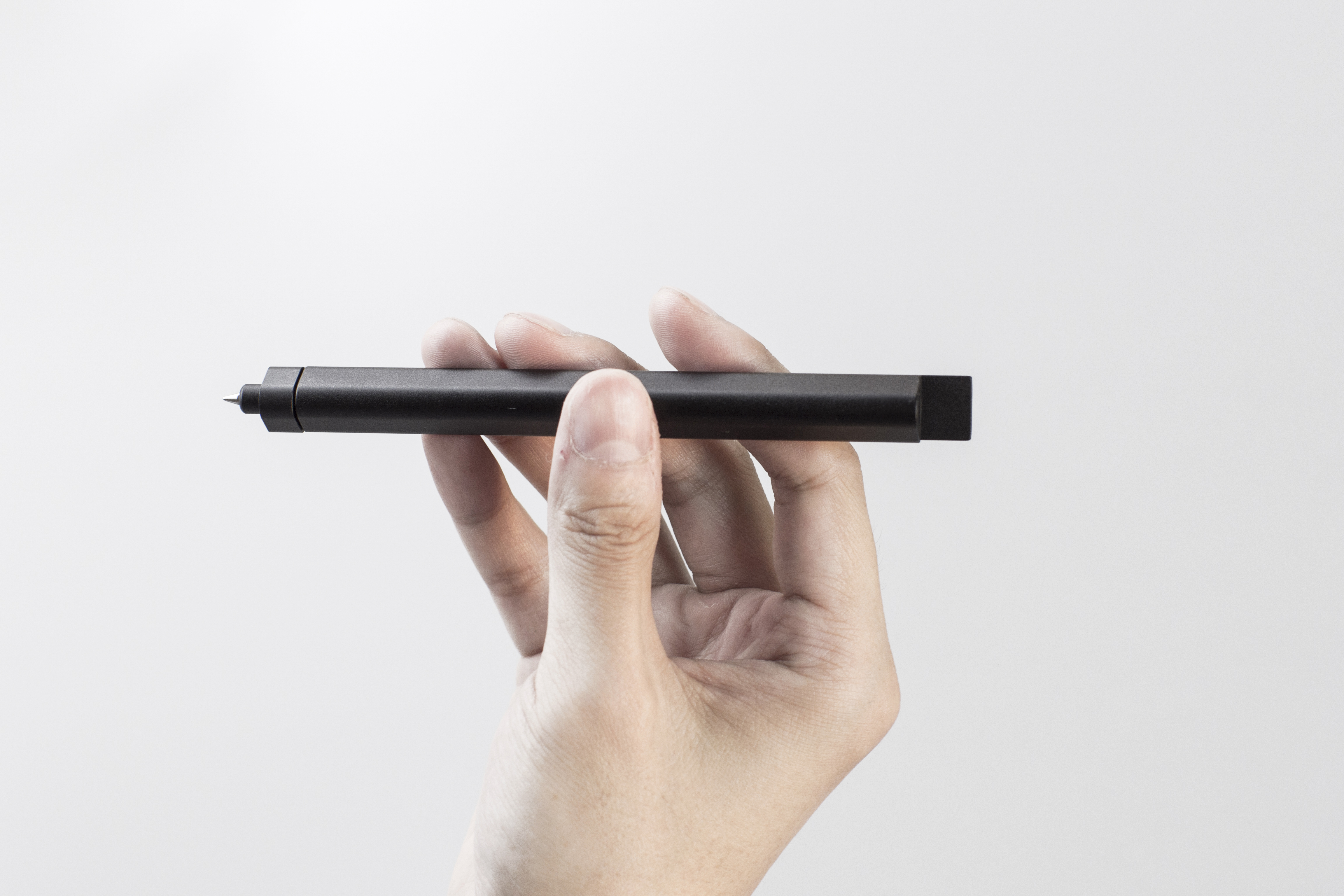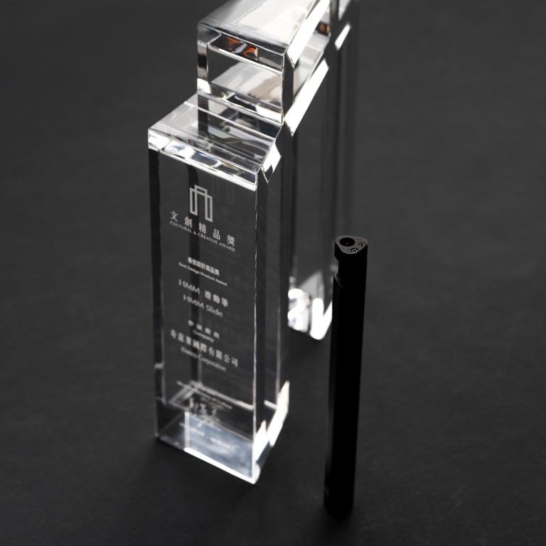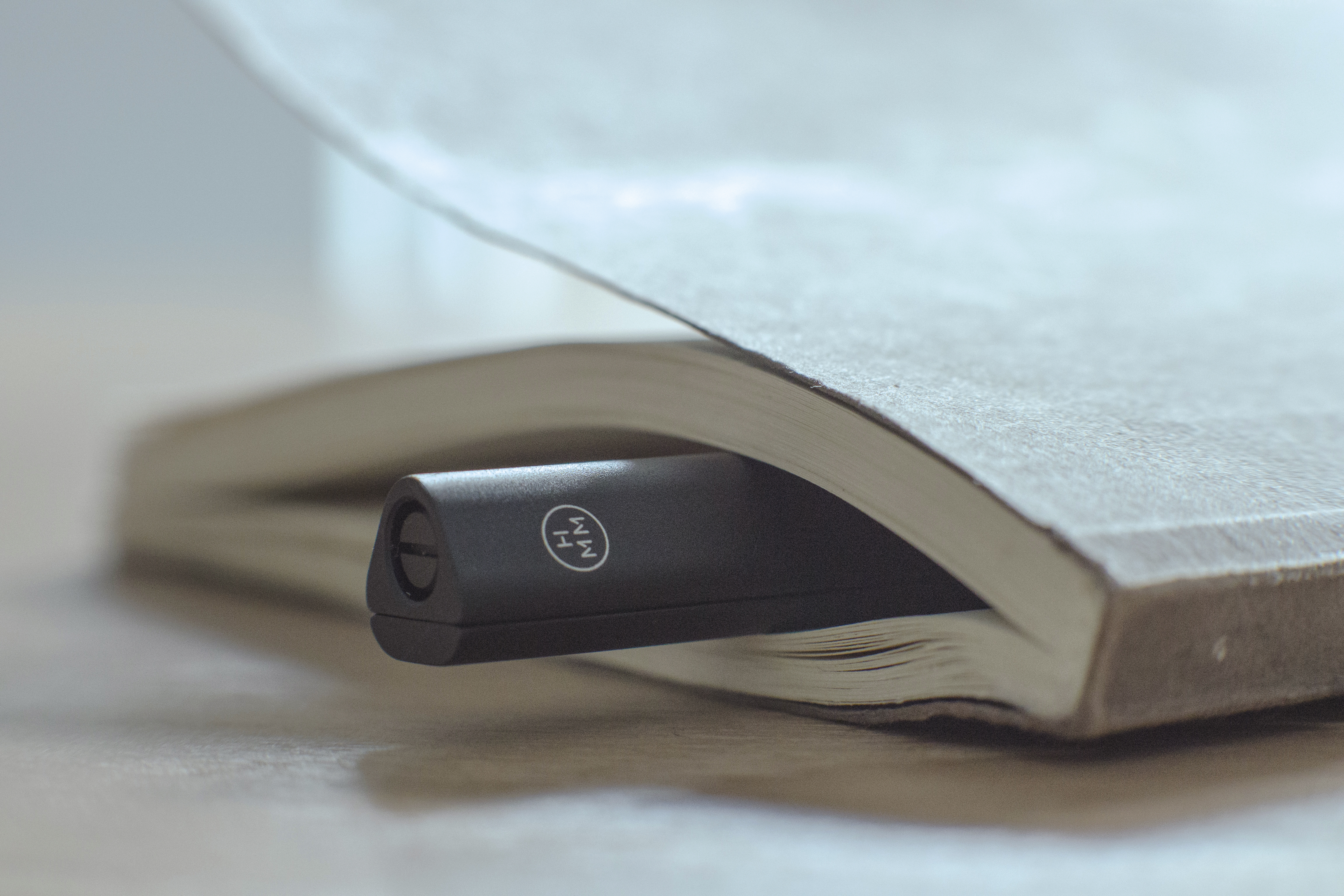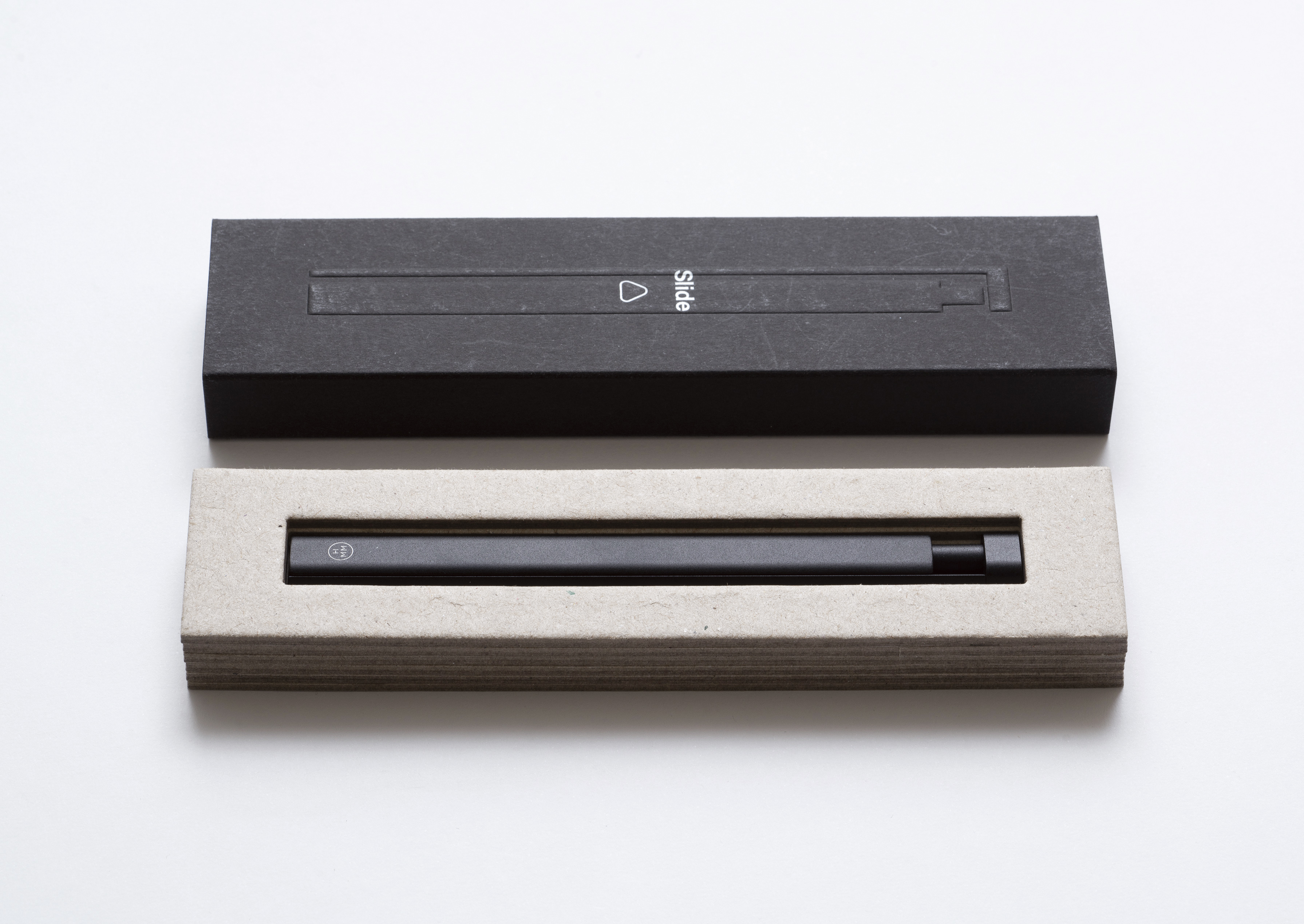 HMM SLIDE – это уникальный дизайнерский комплект, удостоенный премии IF Design Award 2019, полностью сделан из анодированного алюминия с черным матовым покрытием. В комплект входят шариковая ручка и линейка. В корпуса предметов вмонтированы магниты, которые обеспечивают надежную связь между ними. Шариковой ручкой треугольной формы можно писать, даже не отделяя ее от линейки, которая служит своеобразным колпачком для стержня, если вы положите этот комплект в сумку или карман. Комплект весит всего 37 грамм. Набор упакован в коробку из дизайнерского многослойного картона.
