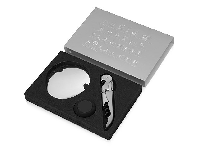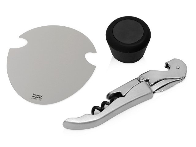 Универсальный набор аксессуаров для вина от Pulltex имеет все важное и необходимое для потребления и сохранения вашего напитка, а именно: классический нож-сомелье, силиконовую пробку и каплеуловитель, с помощью которого очень удобно разливать вино по бокалам. Набор поставляется в подарочной коробке с ложементом. Гравировка (оптоволоконный лазер) (Без чернения) на данный товар осуществляется бесплатно. Оплачивается только настройка оборудования в размере 1100 рублей на весь тираж.
