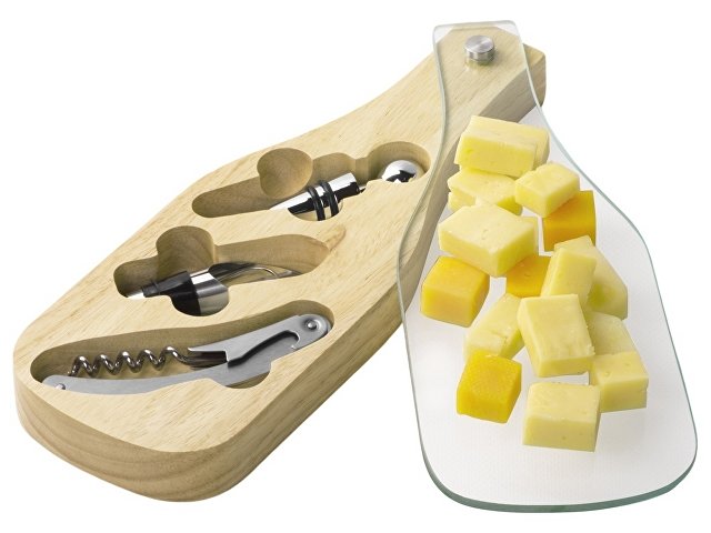 Футляр — в форме бутылки вина, что позволяет обыграть тему благородного напитка при помощи нанесения. Прозрачная стеклянная крышка может быть полностью запечатана УФ-печатью по желанию клиента, который наверняка оценит столь большое поле для нанесения. Кроме того, крышка может быть использована для сервировки на ней сыров или для их нарезки. За соприкосновение с пищей можно не переживать, для этого мы и продумали делать зеркальную печать на крышке с внутренней стороны.