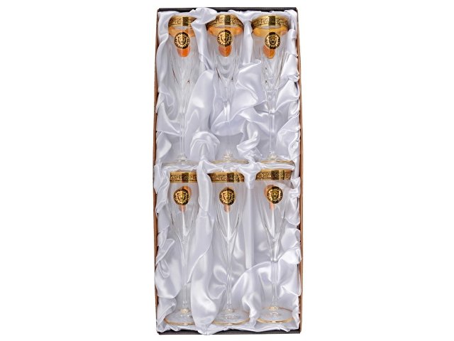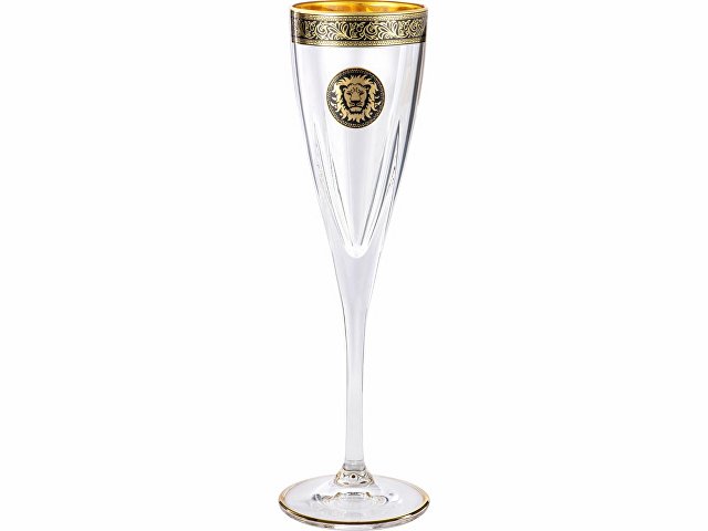 Оригинальный набор бокалов для шампанского, задекорированных золотистым изображением царя зверей – могучего льва. Бокалы выполнены из прозрачного хрусталя с золотистой отделкой по краю и на ножке. Набор рассчитан на 6 персон. Упакован в деревянную коробку. Гравировка (CO2 лазер) (Без чернения) на данный товар осуществляется бесплатно. Оплачивается только настройка оборудования в размере 1100 рублей на весь тираж.