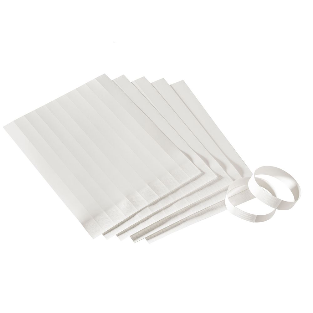 В наборе 100 штук (упаковка из 10 листов по 10 браслетов). Браслет легко отрываются по линии разметки. Изготовлены из водонепроницаемого материала.