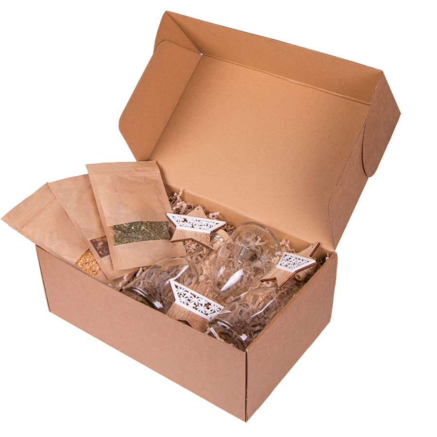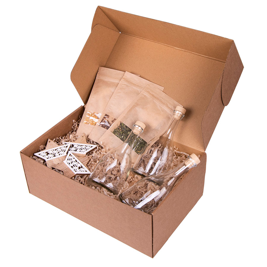 В состав набора арт. 39476 входят: - стружка- коробка подарочная арт. 34931, размер 40 х 25 х 15 см- три стеклянные бутылки объемом 0,5 литра- три полимерные пробки- три сбора для приготовления ликеров.