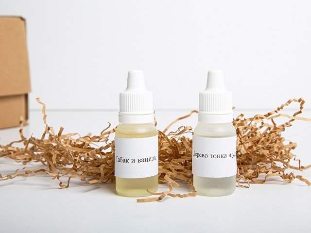 В набор входят сама свечная масса экологичного состава (соевый и кокосовый воск, пищевой парафин), 2 стеклянных стакана, деревянные фитили и держатели, отдушки с ароматами уд-бобы тонка и табак-ваниль и ленточка для декора.
