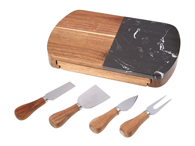 Этот роскошный набор для сыра идеально подходит на роль подарка для любого торжественного случая. Набор изготовлен из черного мрамора и акации: каменная вставка на крышке выполняет не только декоративную, но и практическую функцию, ведь на ней очень удобно резать и раскладывать сыр. Инструменты для резки сыра хранятся в выдвижном ящике под крышкой, для каждого из приспособлений предусмотрена своя вырубленная ниша. Из-за особенностей материала возможны вариации рисунка мрамора и дерева, что может отразиться на выгравированном изображении. Гравировка (CO2 лазер) (Без чернения) на данный товар осуществляется бесплатно. Оплачивается только настройка оборудования в размере 1100 рублей на весь тираж.