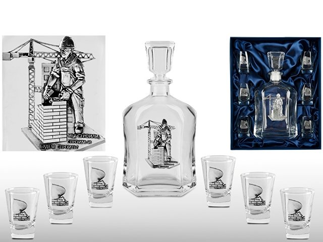 Подарочный набор со штофом СТРОИТЕЛЬ. Традиционная для русского человека комплектация: элегантный графин емкостью 700 мл. с оловянным барельефом СТРОИТЕЛЬ и 6 стопок емкостью 50 мл. с оловянным барельефом Мастерок. Материал барельефов: сплав с содержанием олова не менее 95%(пьютер). Художественное литье,чернение с эффектом антикварного серебра,полировка. Ручная работа. Подарочная упаковка люкс с атласным ложементом синего цвета. Шильд спектрум (Шильд спектрум) на данный товар осуществляется бесплатно. Оплачивается только настройка оборудования в размере 1100 рублей на весь тираж.