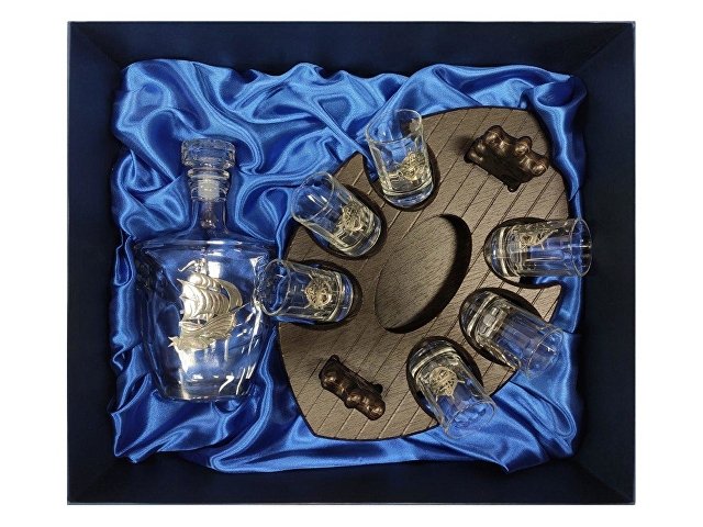 Набор для водки со штофом. В набор входит штоф 0.5 л с оловянным барельефом, шесть стопок 60 мл с оловянным барельефом и подставка мини-бар в форме корабля. Шильд спектрум (Шильд спектрум) на данный товар осуществляется бесплатно. Оплачивается только настройка оборудования в размере 1100 рублей на весь тираж.