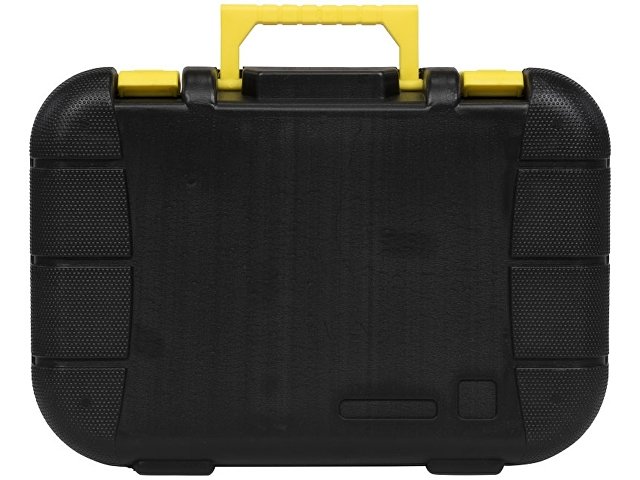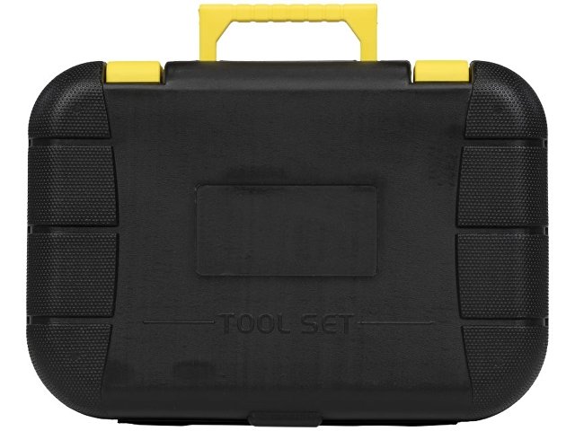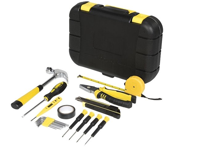 Инструментальный ящик с замком и складной ручкой, включающий молоток-гвоздодер, отвертку с плоским шлицем 4 мм, универсальные плоскогубцы, универсальный нож с фиксатором, 5 шестигранных ключей (2-6 мм) с держателем со стандартными и шаровыми наконечниками, измерительную рулетку длиной 3 м с фиксатором, индикаторную отвертку, изоляционную ленту и 4 прецизионных отвертки. Пластик ABS. Тампопечать (1 цвет (цветные изделия)) на данный товар осуществляется бесплатно. Оплачивается только настройка оборудования в размере 4500 рублей на весь тираж.