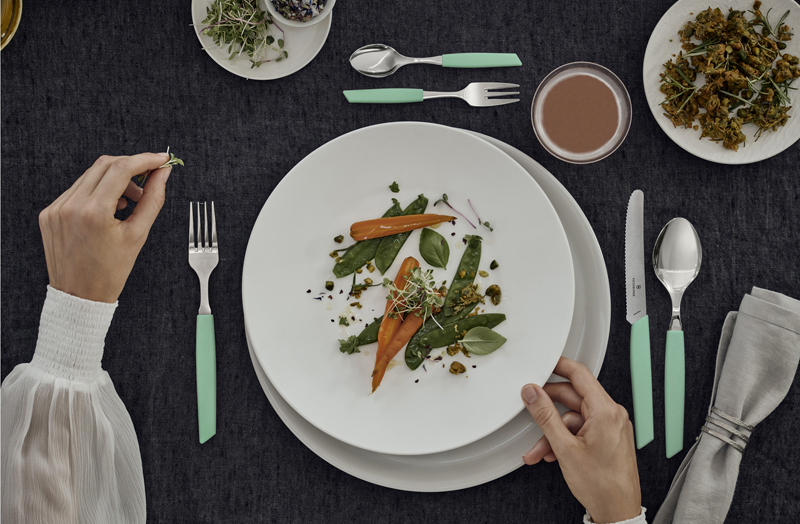 Серия Swiss Modern Extension привнесёт сдержанную элегантность на вашу кухню. Этот изысканный ассортимент столовых приборов изготовлен из прочной нержавеющей стали, пригодной для мытья в посудомоечной машине. Новые яркие тона и минималистичный чёрный цвет ручек с противоскользящим покрытием придают коллекции современную модную эстетику. Лезвия ножей сверхострые и предназначены для легкого нарезания, в то время как остальная часть ассортимента идеально подходит для непринужденной трапезы, которую можно разделить с семьей и друзьями.