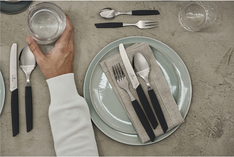 Серия Swiss Modern Extension привнесёт сдержанную элегантность на вашу кухню. Этот изысканный ассортимент столовых приборов изготовлен из прочной нержавеющей стали, пригодной для мытья в посудомоечной машине. Новые яркие тона и минималистичный чёрный цвет ручек с противоскользящим покрытием придают коллекции современную модную эстетику. Лезвия ножей сверхострые и предназначены для легкого нарезания, в то время как остальная часть ассортимента идеально подходит для непринужденной трапезы, которую можно разделить с семьей и друзьями.