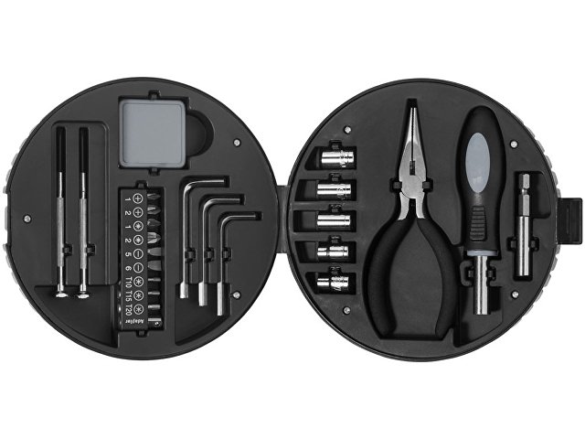 Набор из 25 инструментов включает измерительную минирулетку, крестообразную отвертку, плоскую отвертку, 9 насадок с адаптером (4 крестообразных шлицев, 2 плоских шлица и 3 шестигранных шлица), 3 шестигранных ключа, 5 головок (5-9 мм), острогубцы, рукоятку отвертки, адаптер для насадок и удобный футляр. Тампопечать (1 цвет (цветные изделия)) на данный товар осуществляется бесплатно. Оплачивается только настройка оборудования в размере 4500 рублей на весь тираж.