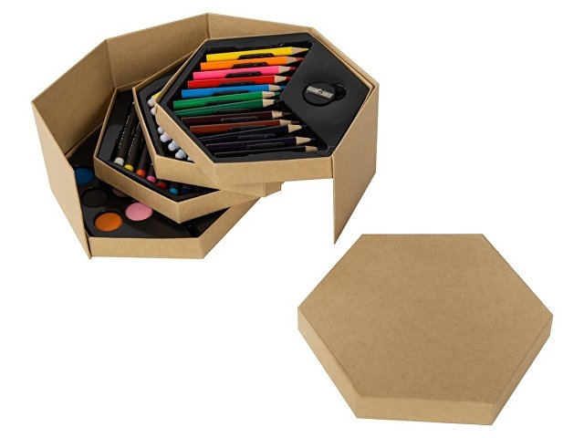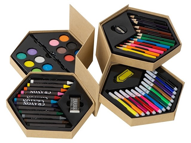 Набор из 52 предметов для рисования. 12 маркеров, 12 цветных карандашей, 12 восковых карандашей, 12 акварельных красок, кисточка, точилка, резинка и большая скрепка. Тампопечать (1 цвет (цветные изделия)) на данный товар осуществляется бесплатно. Оплачивается только настройка оборудования в размере 4500 рублей на весь тираж.