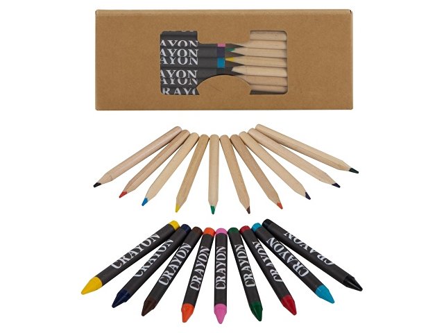 Набор из 19 карандашей. 9 цветных восковых карандашей и 10 цветных карандашей в картонной коробке с пластиковым окошком. Тампопечать (1 цвет (цветные изделия)) на данный товар осуществляется бесплатно. Оплачивается только настройка оборудования в размере 4500 рублей на весь тираж.
