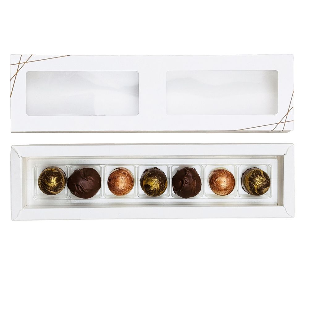 Набор из семи изысканных конфет ручной работы — это настоящее произведение кондитерского искусства, созданное для того, чтобы удовлетворить самые утонченные вкусы. Каждая конфета в этом наборе — это не просто лакомство, а целая история, заключенная в тонкую оболочку шоколада.