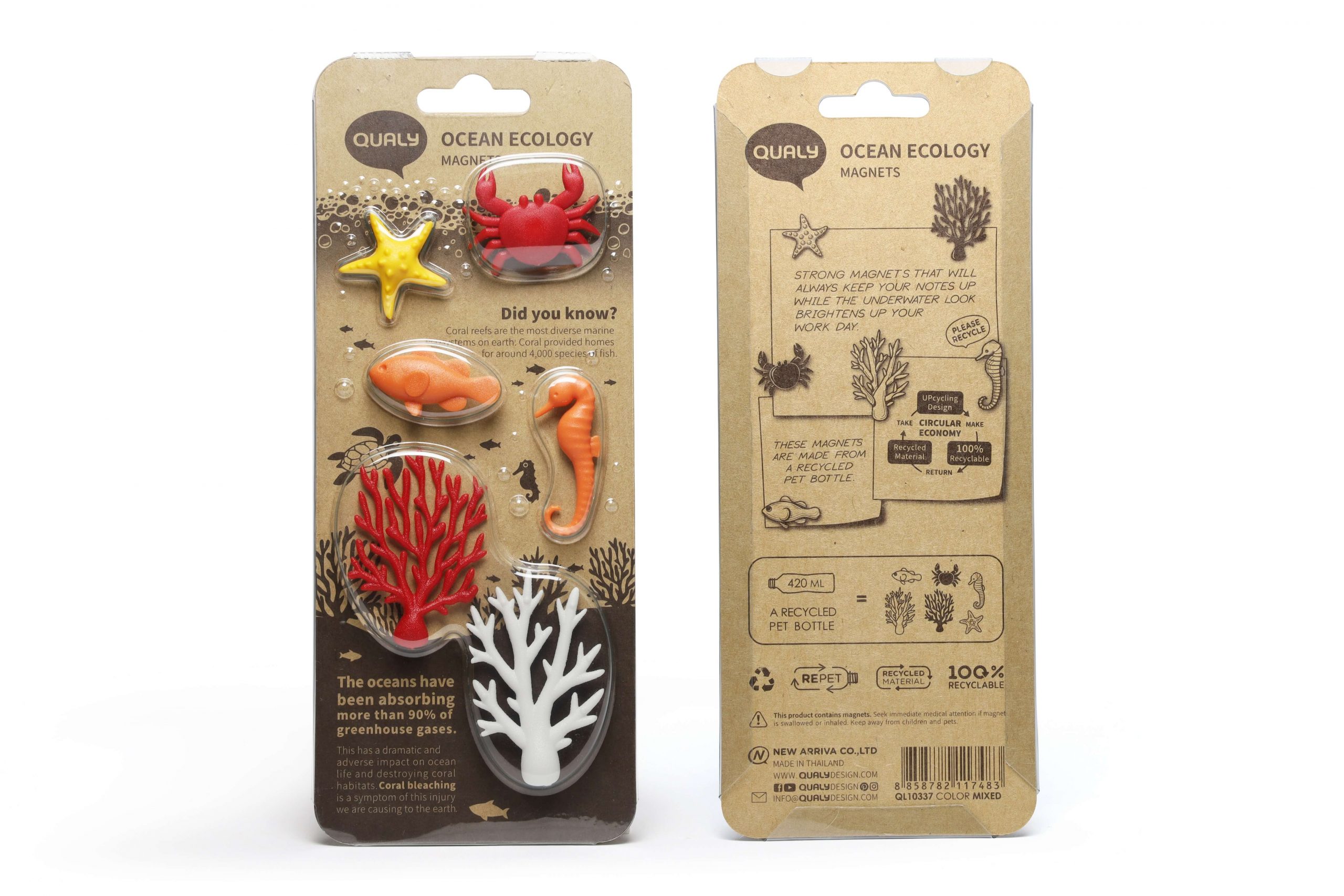 Магниты на холодильник в морской тематике – практичные держатели для заметок и украшения со смыслом. Фигурки морских обитателей – это напоминание о необходимости заботиться об окружающей среде, сократить выбросы отходов в мировой океан, замедлить климатические изменения. Магниты произведены из переработанной пластиковой бутылки. Материал прочен и безопасен для окружающей среды. Страна изготовитель — Таиланд. Страна бренда — Таиланд.