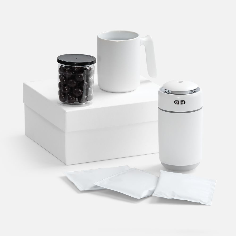 Набор «Микроклимат» создаст идеальную атмосферу — для бодрости или расслабления! Увлажнитель смягчает воздух, поможет снять усталость и мыслить ясно. В удобной керамической кружке Visari любимый напиток сохранит тепло, дрип-пакеты позволят легко приготовить вкусный кофе без лишних приборов, а фундук в шоколаде станет изящным завершением вашего ритуала наслаждения.
