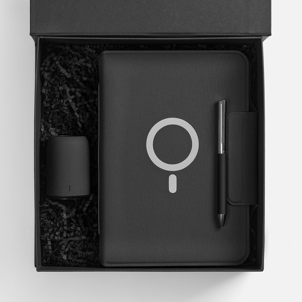 Центральное место в наборе, конечно, занимает органайзер Oiro с блокнотом, подставкой для смартфона и встроенным аккумулятором для беспроводной зарядки — практичное смарт-решение в организации рабочего процесса, где каждая деталь продумана для максимального комфорта, а использование органайзера приносит подлинное удовольствие.