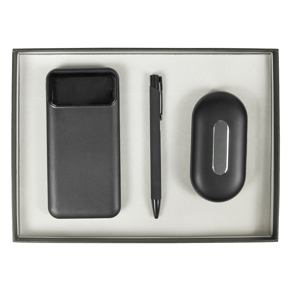 Представляем вашему вниманию набор Solution Prestige Quardo, идеальный аксессуар для деловых людей, ценящих порядок, стиль и технологии. Этот элегантный черный набор включает в себя все необходимое для успешного и организованного дня: стильный ежедневник для ваших заметок и планов, внешний беспроводной аккумулятор для поддержания работы ваших устройств в любой момент, высококачественные наушники для идеального звука во время ваших перемещений и изысканная ручка, которая добавит уверенности в каждое ваше слово. Набор Solution Prestige Quardo — это сочетание функциональности и стиля, которое подчеркнет вашу индивидуальность и профессионализм.
