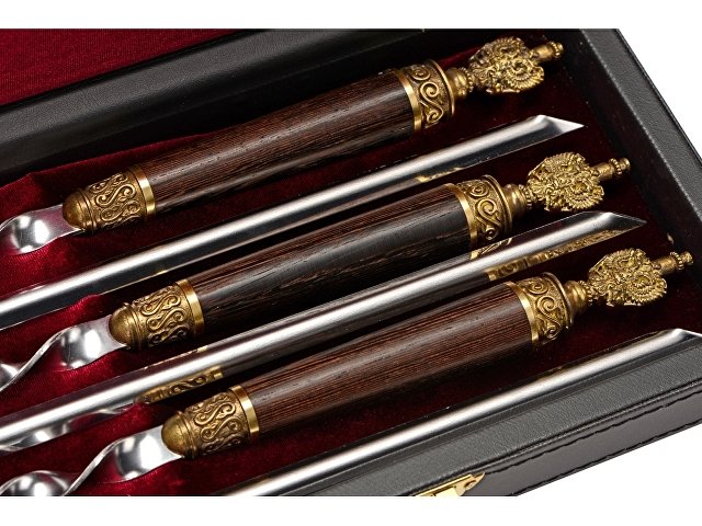 Шампура из нержавеющей стали с ручками из дерева венге и литьем в виде герба РФ. Дипломат из натуральной кожи с бархатной отделкой.