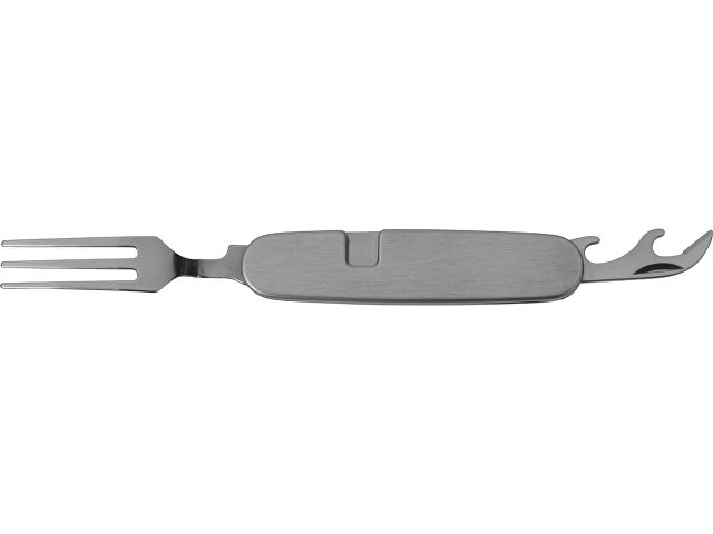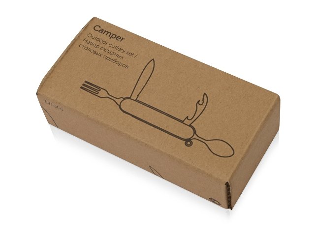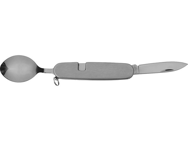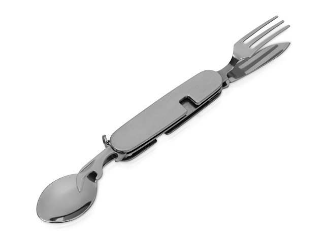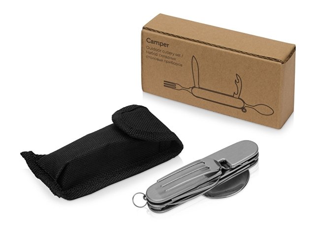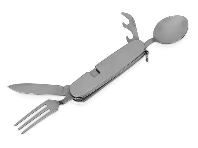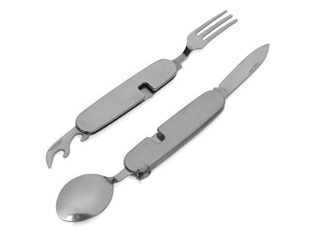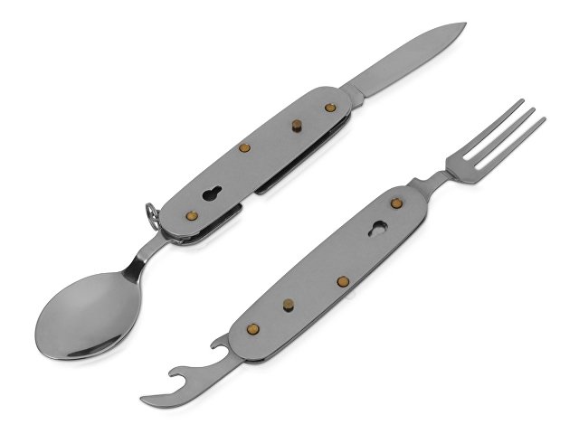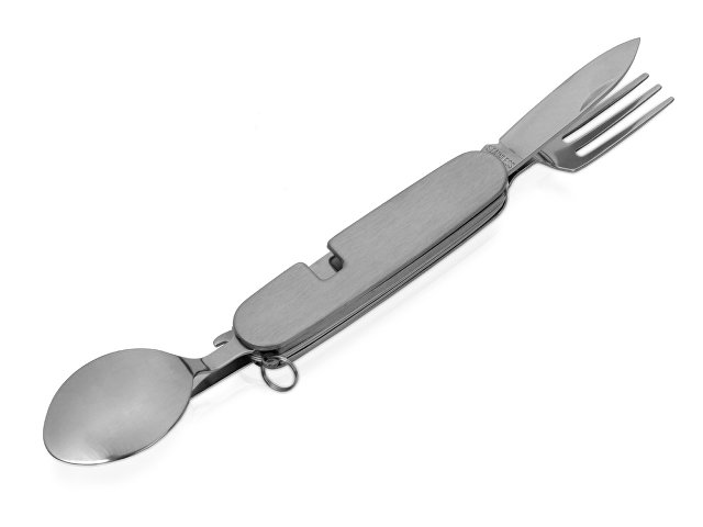В нем есть все, что необходимо - ложка, вилка, ножик, открывалка бутылок и жестяных банок. Также имеется удобное кольцо для подвешивания. Набор разделяется на две части.