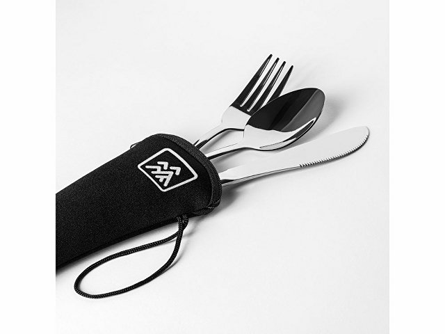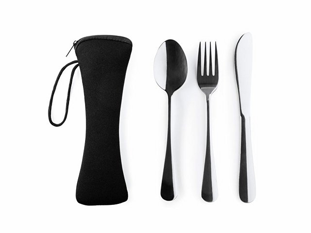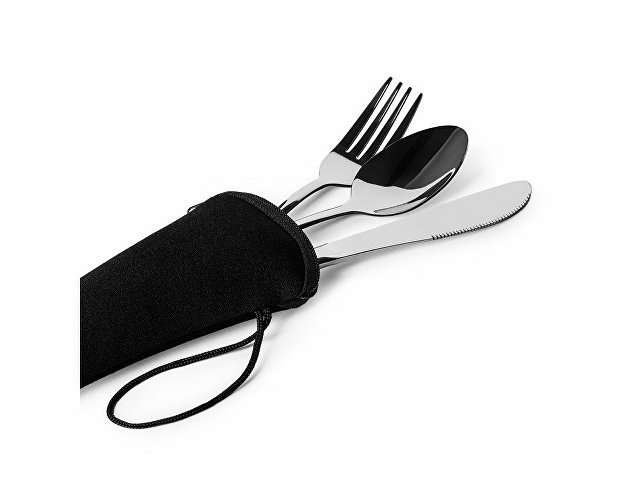 Набор столовых приборов из нержавеющей стали в практичном неопреновом футляре. Включает в себя вилку, нож и ложку, идеально подходящие для того, чтобы брать их с собой куда угодно. Гравировка (оптоволоконный лазер) (Без чернения) на данный товар осуществляется бесплатно. Оплачивается только настройка оборудования в размере 1100 рублей на весь тираж.