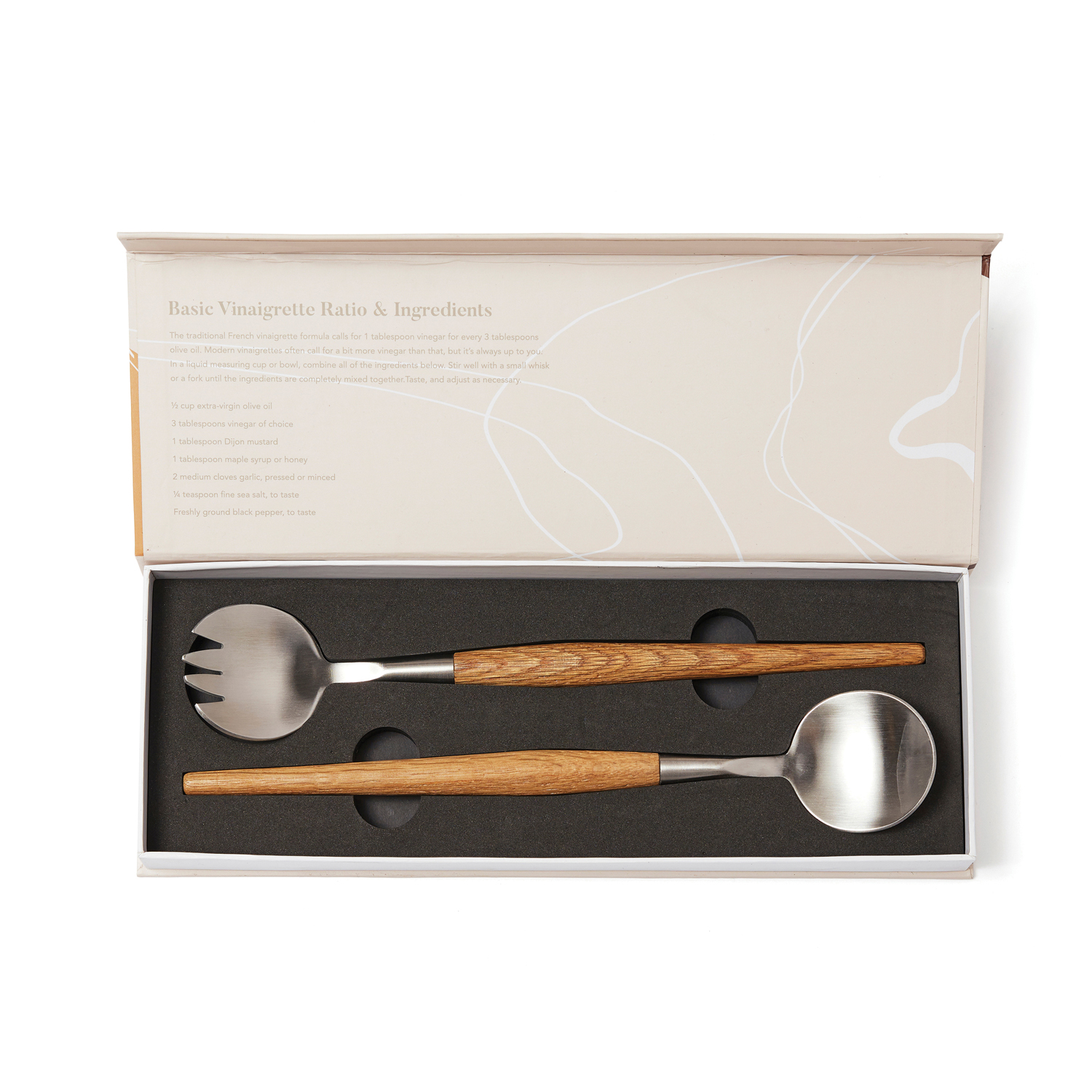 Любители гастрономии оценят набор для сервировки из серии Retro от бренда VINGA. В него входят ложка и ложка-вилка, которыми очень удобно перемешивать салат. Приборы изготовлены из нержавеющей стали, а их ручки — из прочного дуба. Набор выполнен в классическом скандинавском стиле и упакован в подарочную коробку. Превратите свой повседневный ужин в особенное событие!