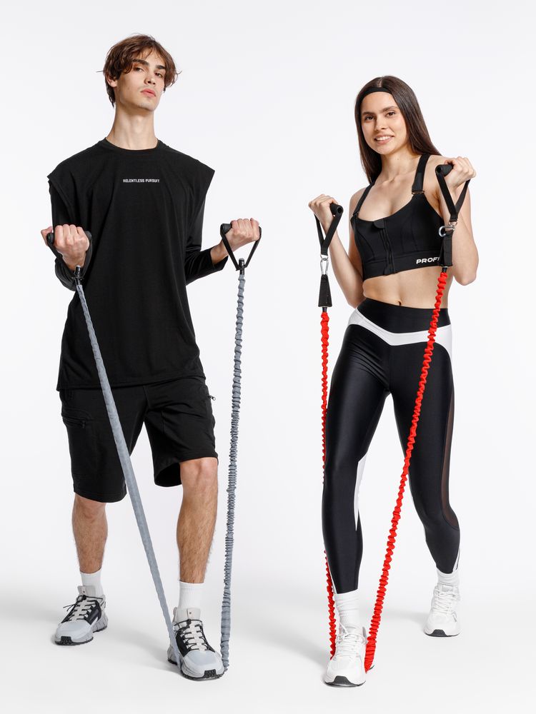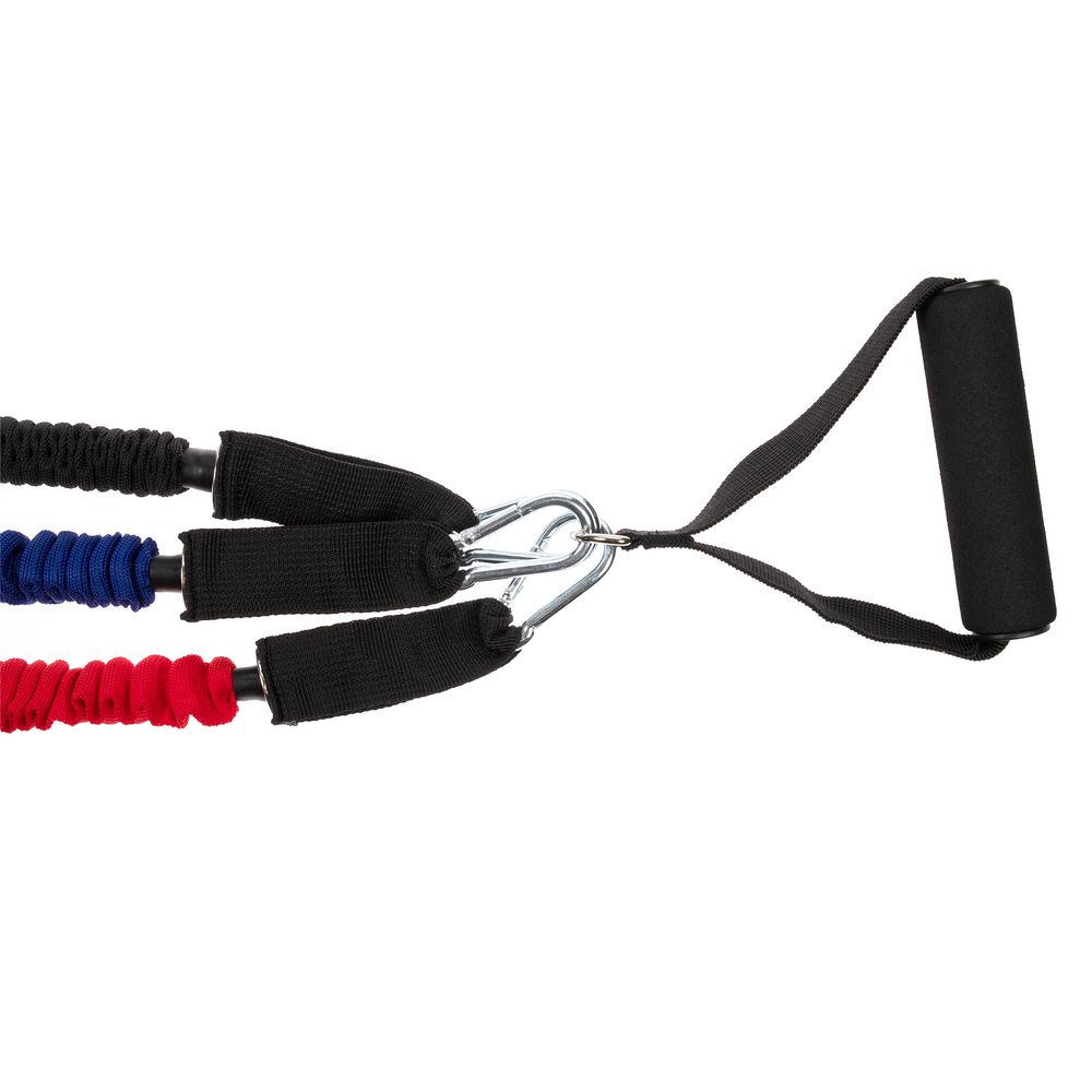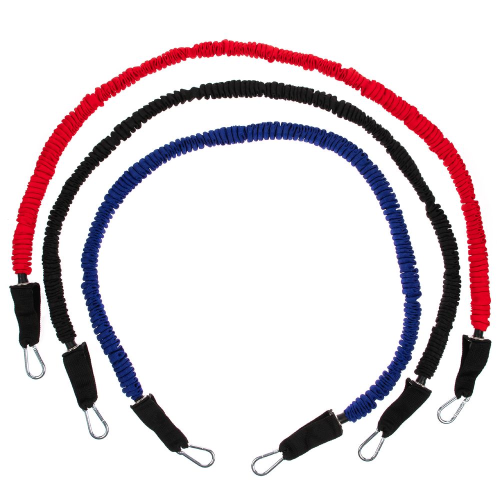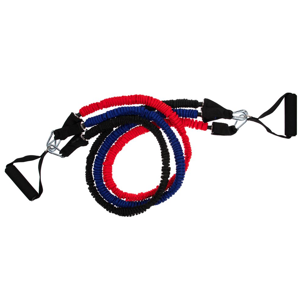 В набор входит 3 трубчатых эспандера с разной степенью нагрузки от 6,8 до 15,8 кг. Меняя и комбинируя их, можно усиливать или ослаблять нагрузку во время тренировки.