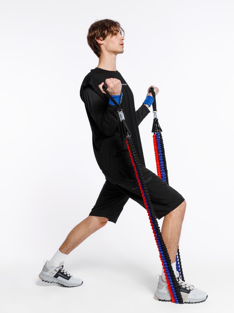 Латексные тросы эспандеров помещены в тканевые чехлы, которые защищают их от повреждения. Рукоятки с покрытием из мягкого нескользящего вспененного материала обеспечивают удобство и надежность хвата.