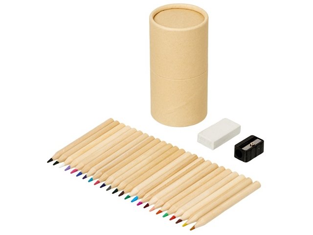Набор из 24 цветных карандашей, ластика и точилки в круглом картонном футляре, который удобно использовать как карандашницу. Тампопечать (1 цвет (цветные изделия)) на данный товар осуществляется бесплатно. Оплачивается только настройка оборудования в размере 4500 рублей на весь тираж.